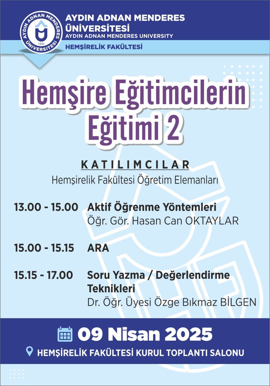 Fakültemiz Bilimsel Etkinlik ve Sürekli EÄŸitim Komisyonu'nca 09.04.2025 ÇarÅŸamba günü 13.00-17.00 saatleri arasında HemÅŸire EÄŸitimcilerin EÄŸitimi-2 düzenlenecektir.