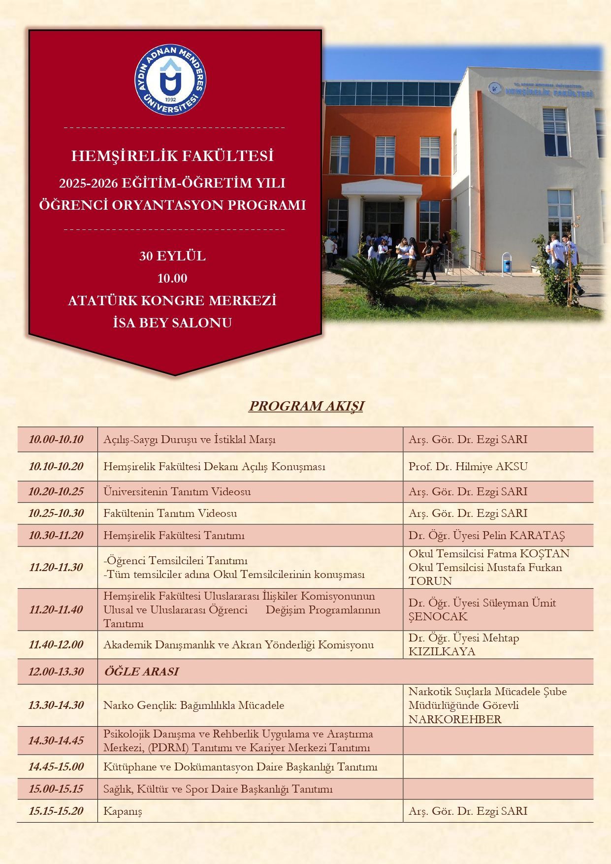 Fakültemiz Oryantasyon Komisyonunca, 30 Eylül 2025 Salı günü 10:00-16:00 saatleri arasında, Atatürk Kongre Merkezi İsa Bey Salonunda Fakültemiz 1. Sınıf öÄŸrencilerine yönelik oryantasyon programı yapılacaktır. Fakültenin 1. sınıf öÄŸrencilerinin katılımı zorunludur.