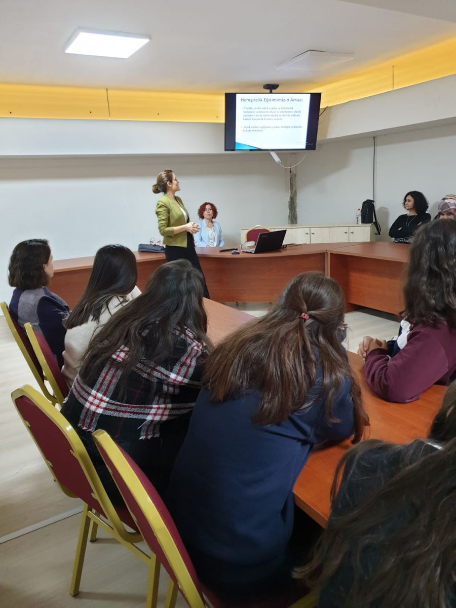 HemÅŸirelik Fakültesi Dekanlığı ve Fakülte GeliÅŸtirme ve Tanıtım Komisyonu tarafından 09.12.2019 tarihinde Åžehit Polis Nedip Cengiz Eker Mesleki ve Teknik Anadolu Lisesine ziyaret gerçekleÅŸtirildi. İldeki saÄŸlık meslek lisesine planlanan bu ziyarete, dekan yardımcısı ve komisyon baÅŸkanı Dr. ÖÄŸr. Üyesi Hatice Öner ile aynı komisyonda görev yapan Dr. ÖÄŸr. Üyesi Hatice Yıldız, ArÅŸ. Gör. Belma ToptaÅŸ ve ArÅŸ. Gör. TuÄŸba Dündar katılmıştır. HemÅŸirelik Fakültesinin tanıtımının amaçlandığı buluÅŸmada lise son sınıf öÄŸrencilerine ArÅŸ. Gör. Belma ToptaÅŸ tarafından fakültemizin tanıtım sunumu yapıldı ve tanıtım videosu izletildi. Ardından ziyaret edilen lisenin saÄŸlık bölümü öÄŸrencilerinin hemÅŸirelikte lisans eÄŸitimi, fakültemizin ders içerikleri, uygulama alanları ve Erasmus gibi konularda yönelttikleri sorular komisyon üyeleri tarafından yanıtlandı. ÖÄŸrencilerin ilgisinin yoÄŸun olduÄŸu toplantı, fakültemiz müzik grubu üyeleri Samet Durna, Ferhat Demir ve Yunus Nas tarafından gerçekleÅŸtirilen müzik dinletisi ile sona erdi. Hem verimli hem de keyifli geçen bu ziyaret bitiminde HemÅŸirelik Fakültesi ile saÄŸlık meslek lisesi arasında farklı alanlarda da iÅŸbirliÄŸinin devam etmesine yönelik dilekler karşılıklı olarak iletildi.