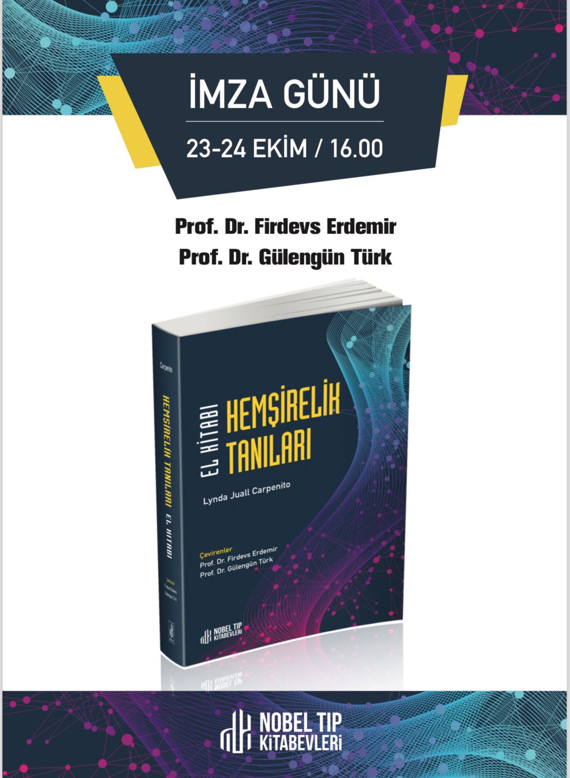 HemÅŸirelik Fakültesi öÄŸretim üyesi Prof. Dr. Gülengün Türk ve emekli öÄŸretim üyesi Prof.Dr. Firdevs Erdemir tarafından Türkçe’ye çevrilen, hemÅŸirelikte tüm dünyada ve ülkemizde yaygın olarak kullanılan kaynaklardan biri olan HemÅŸirelik Tanıları El Kitabının imza günü 24 Ekim 2024 tarihinde Dokuz Eylül Üniversitesi Sürekli EÄŸitim Merkezinde gerçekleÅŸti. Okuyucuları ile bir araya gelen Hocalarımız kitaplarını imzaladı.