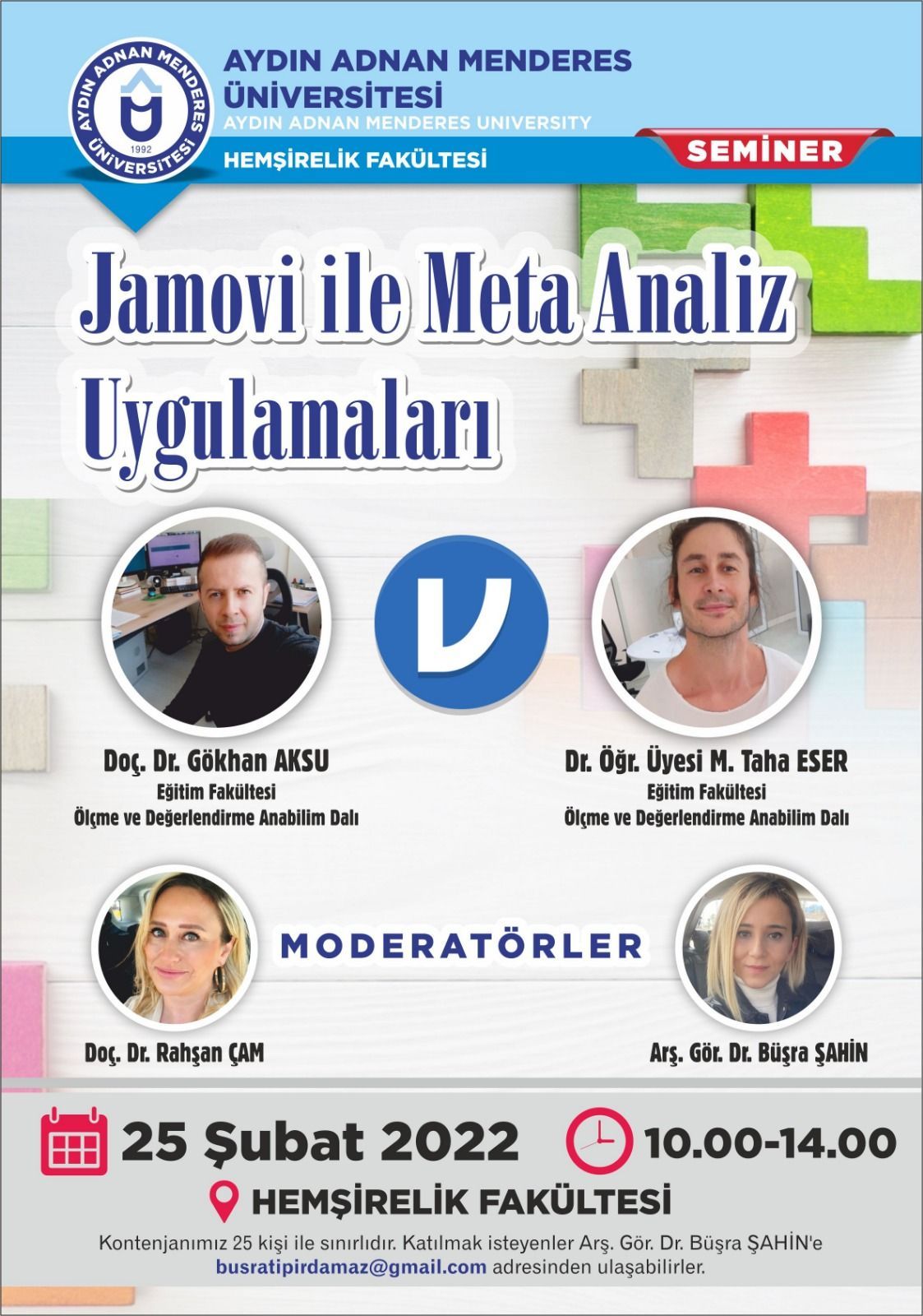 Fakültemiz bilimsel etkinlikleri kapsamında; 25 Şubat 2022 tarihinde, 10:00-14:00 saatleri arasında, "Jamovi ile Meta Analiz Uygulamaları" adlı etkinlik gerçekleştirilecektir.