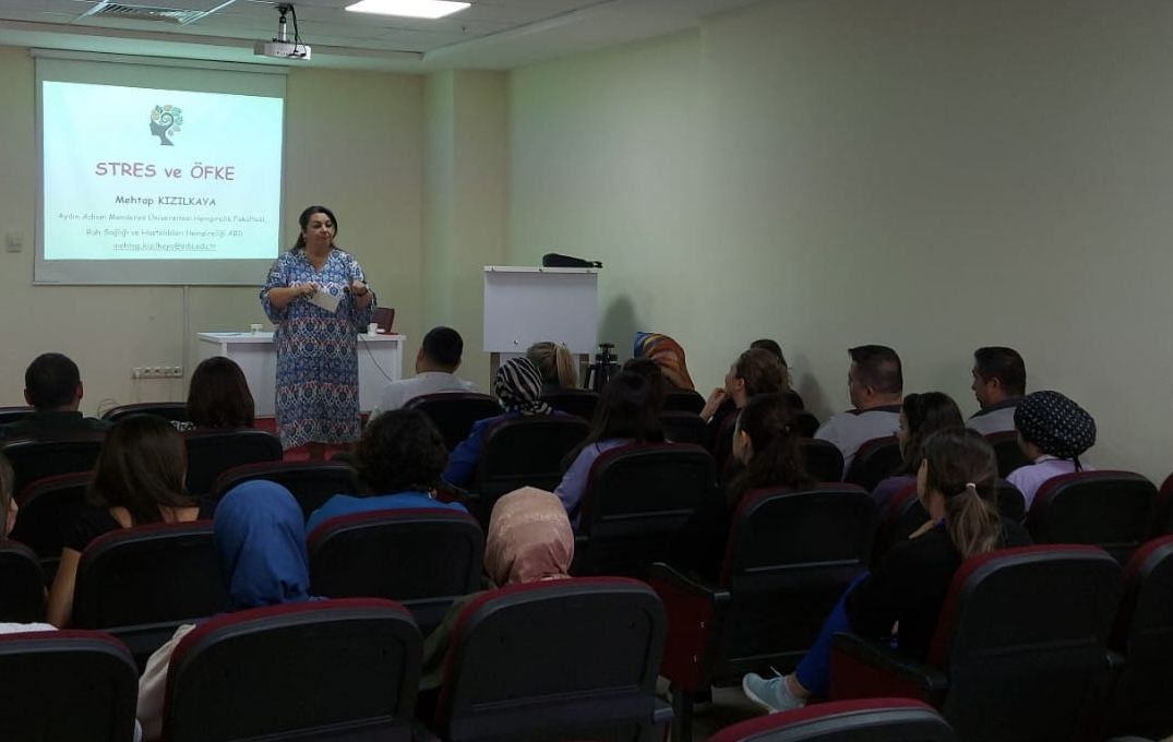 Fakültemiz Ruh SaÄŸlığı ve Hastalıkları HemÅŸireliÄŸi Anabilim Dalı’ndan Dr. ÖÄŸr. Üyesi Mehtap KIZILKAYA tarafından 22 Ekim 2024 tarihinde saat 15.00-17.00 arasında İl SaÄŸlık MüdürlüÄŸü Aydın Ağız ve DiÅŸ SaÄŸlığı Merkezi’nde çalışan saÄŸlık personeline “Stres Yönetimi ve Öfke Kontrolü” baÅŸlıklı eÄŸitim verildi. GevÅŸeme egzersizi ile baÅŸlayan eÄŸitim katılımcılardan alınan olumlu geri bildirimler ile sona erdi.
