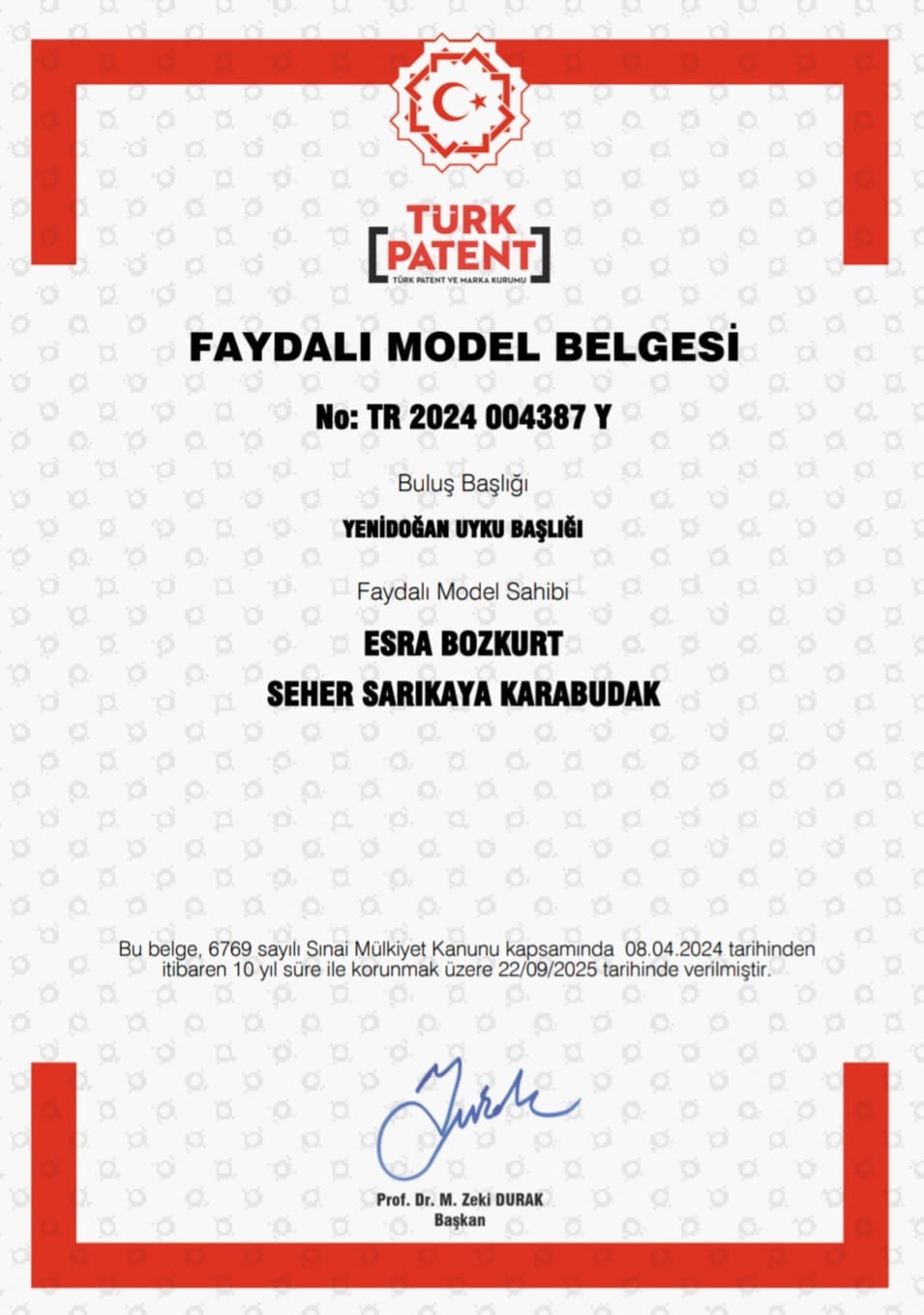 Hemşirelik Fakültesi Çocuk Sağlığı ve Hastalıkları Hemşireliği Anabilim Dalı öğretim üyesi Doç. Dr. Seher SARIKAYA KARABUDAK ile doktora öğrencisi Esra BOZKURT tarafından geliştirilen “Yenidoğan Uyku Başlığı” isimli buluş, Türk Patent ve Marka Kurumu tarafından faydalı model olarak tescillenmiştir. Buluş, yenidoğan yoğun bakım ünitesinde yatan hasta yenidoğanların; ünitedeki çevresel faktörlerden olan ışık ve sesten korunmasını sağlayarak bebeklerin uyku sürecine ve sirkadyen ritminin oluşmasına katkı sağlamayı hedeflemektedir.