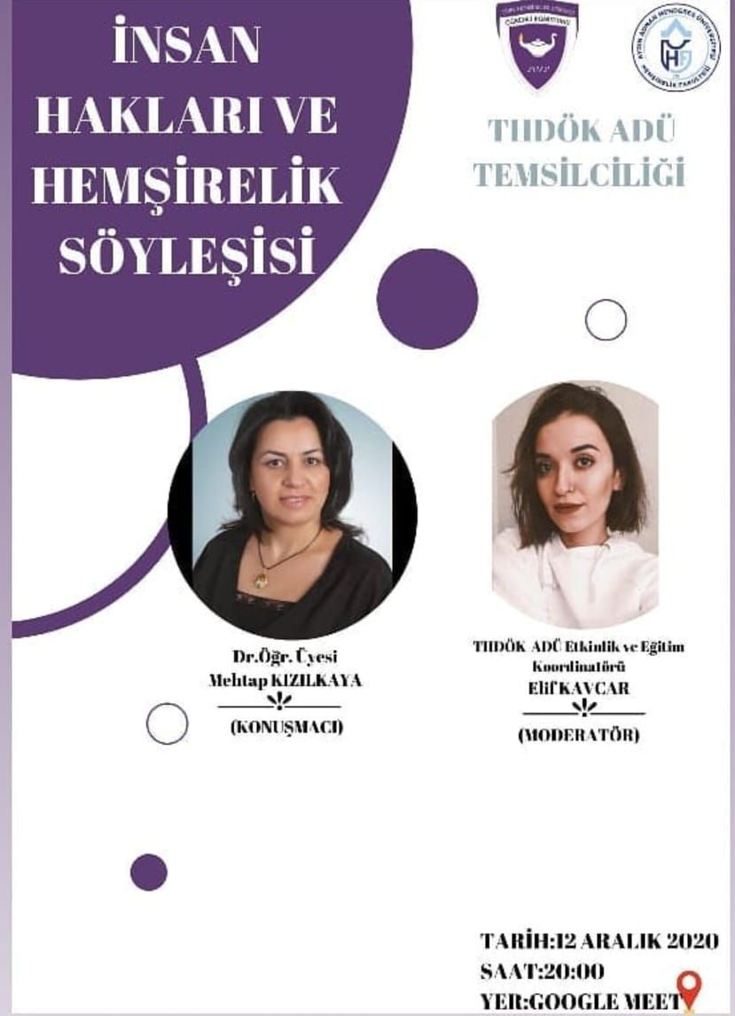 Yönetimini fakülte öÄŸrencilerimizin oluÅŸturduÄŸu THDÖK ADÜ TemsilciliÄŸi, 10 Aralık İnsan hakları günü anma etkinliÄŸi düzenledi. Fakülte hocalarımızdan Dr. ÖÄŸr. Üyesi Mehtap KIZILKAYA’nın konuÅŸmacı olarak katılımıyla 12 Aralık 2020 saat 20:00 da online olarak İnsan Hakları ve HemÅŸirelik SöyleÅŸisi gerçekleÅŸti.