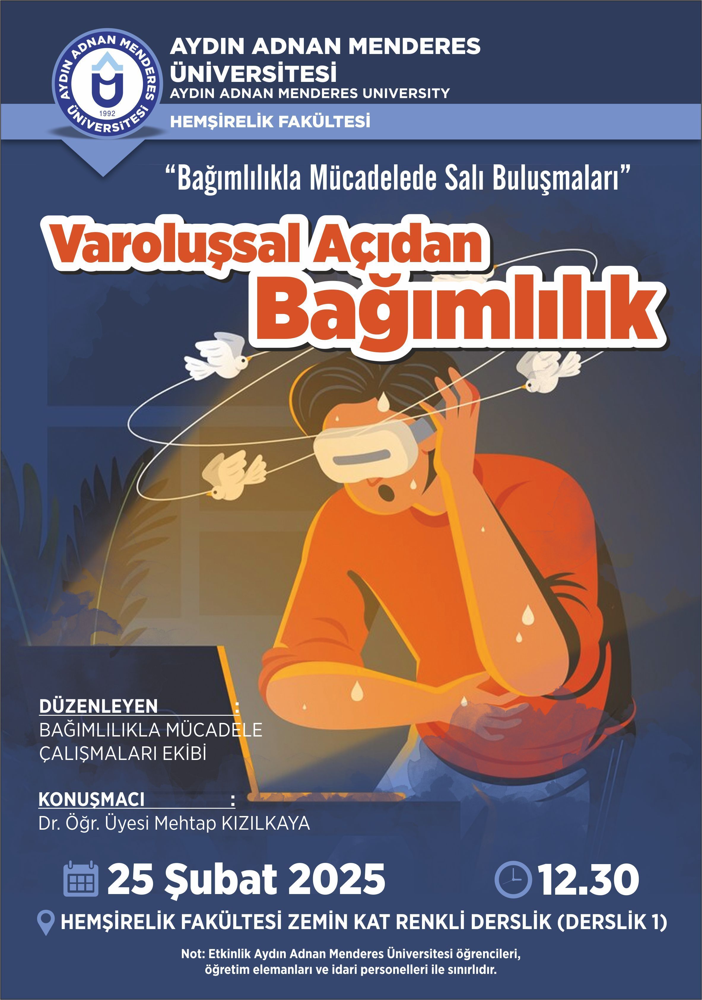 "Bağımlılıkla Mücadele Salı Buluşmaları" kapsamında, 25 Şubat 2025 günü saat 12:30'da Fakültemiz binasında bulunan renkli sınıfta Dr.Öğr.Üyesi Mehtap KIZILKAYA'nın sunumuyla gerçekleşecek olan "Varoluşsal Açıdan Bağımlılık" konulu etkinliğe katılımlarınızı bekleriz.