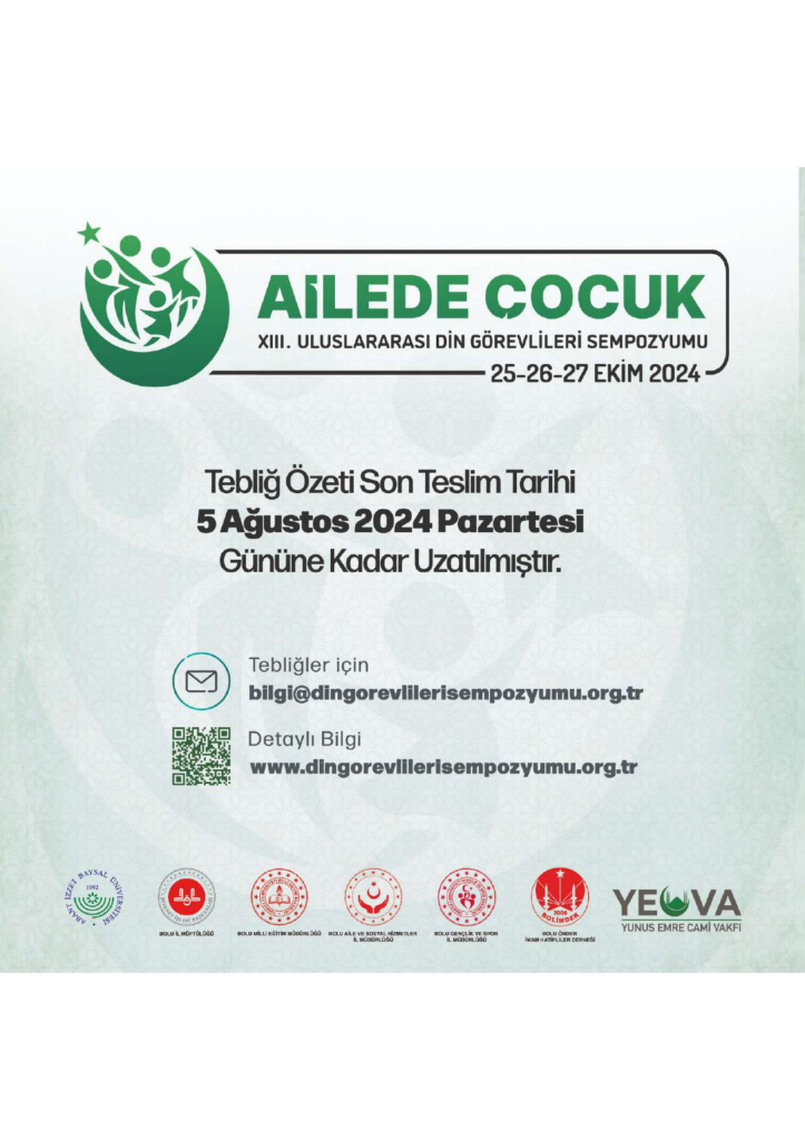 Bolu Abant İzzet Baysal Üniversitesi Bolu İl Müftülüğü, Bolu Milli Eğitim Müdürlüğü, Bolu Aile ve Sosyal Hizmetler İl Müdürlüğü, Bolu Gençlik ve Spor İl Müdürlüğü, Bolu Önder İmam Hatipliler Derneği ve Yunus Emre Cami Vakfı işbirliğinde Bolu Abant İzzet Baysal Üniversitesi Konferans Salonunda 25-26-27 Ekim 2024 tarihleri arasında "Ailede Çocuk XIII. Uluslararası Din Görevlileri Sempozyumu" düzenlenecektir.