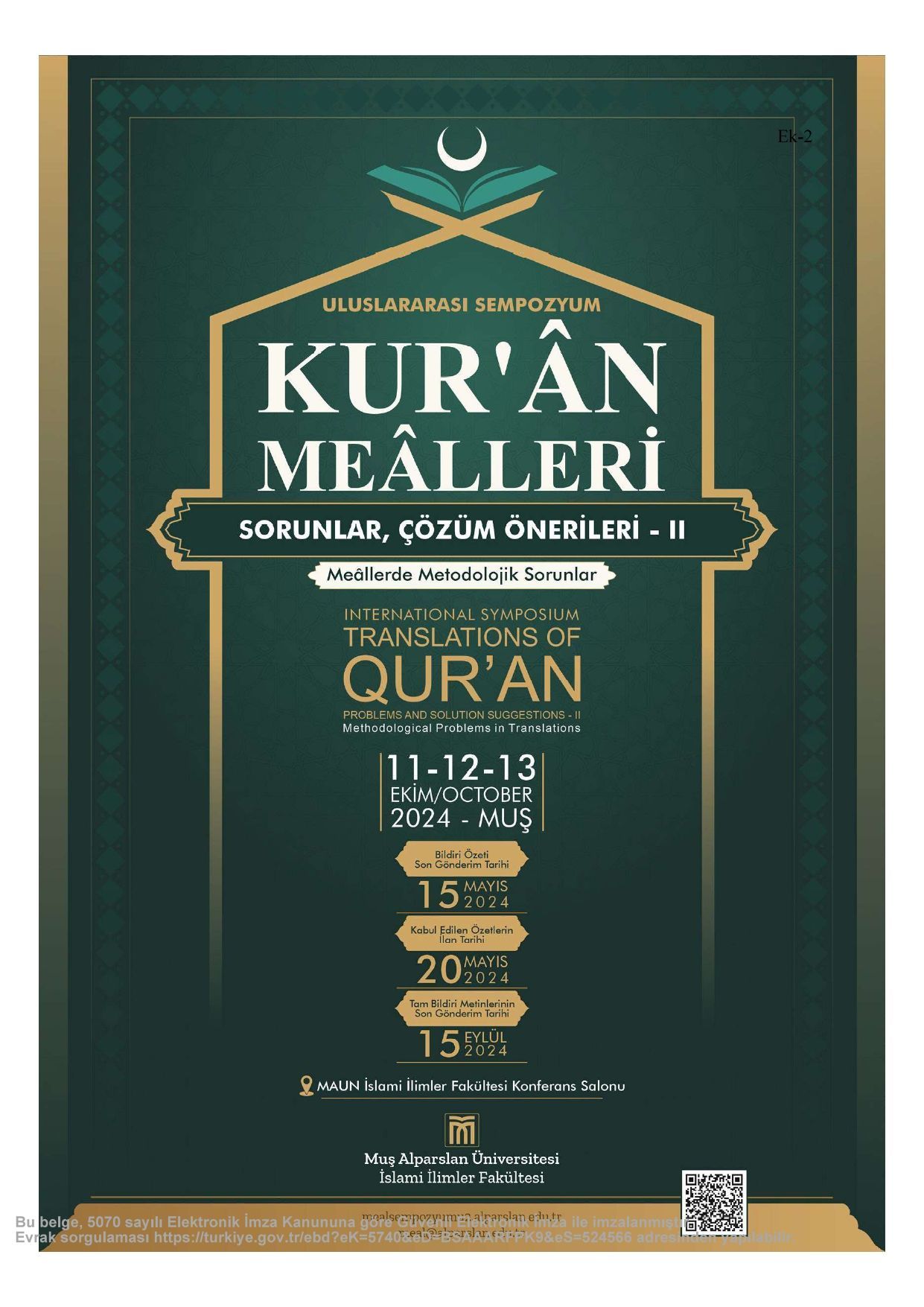 Muş Alparslan Üniversitesi ev sahipliğinde 11-13 Ekim 2024 tarihleri arasında "Kur'ân Meâlleri: Sorunlar, Çözüm Önerileri-II" konulu uluslararası sempozyum yapılması planlanmaktadır.