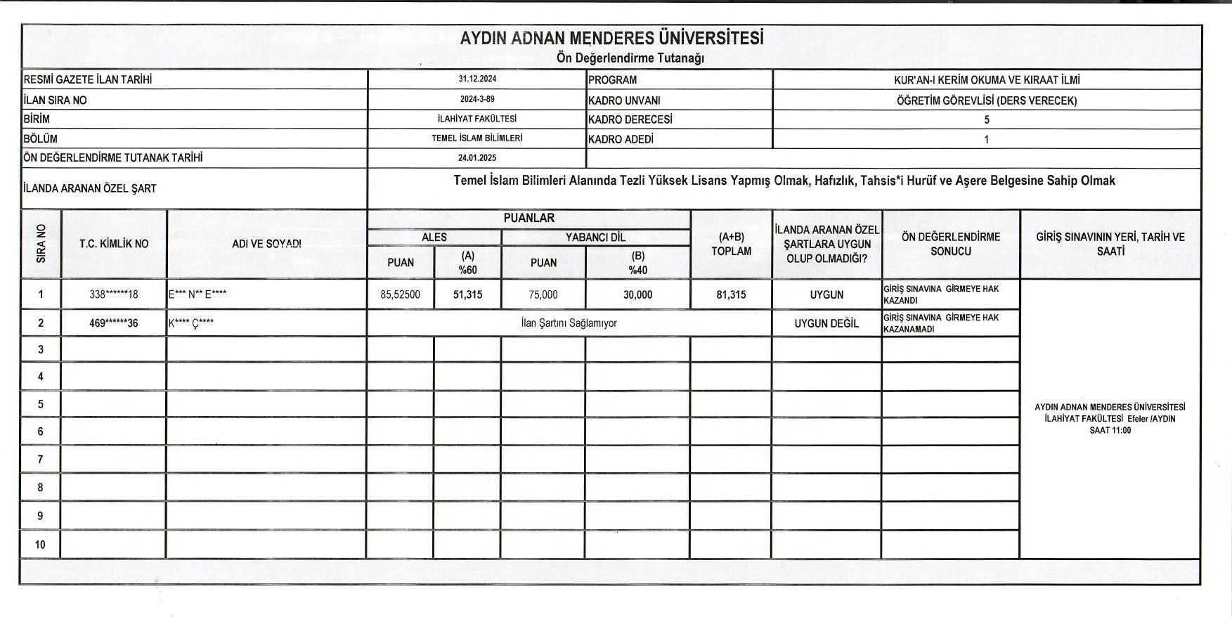 TEMEL İSLAM BİLİMLERİ BÖLÜMÜ KUR’AN-I KERİM OKUMA VE KIRÂAT İLMİ ANABİLİM DALI ÖĞRETİM GÖREVLİSİ ÖN DEĞERLENDİRME SONUCU
