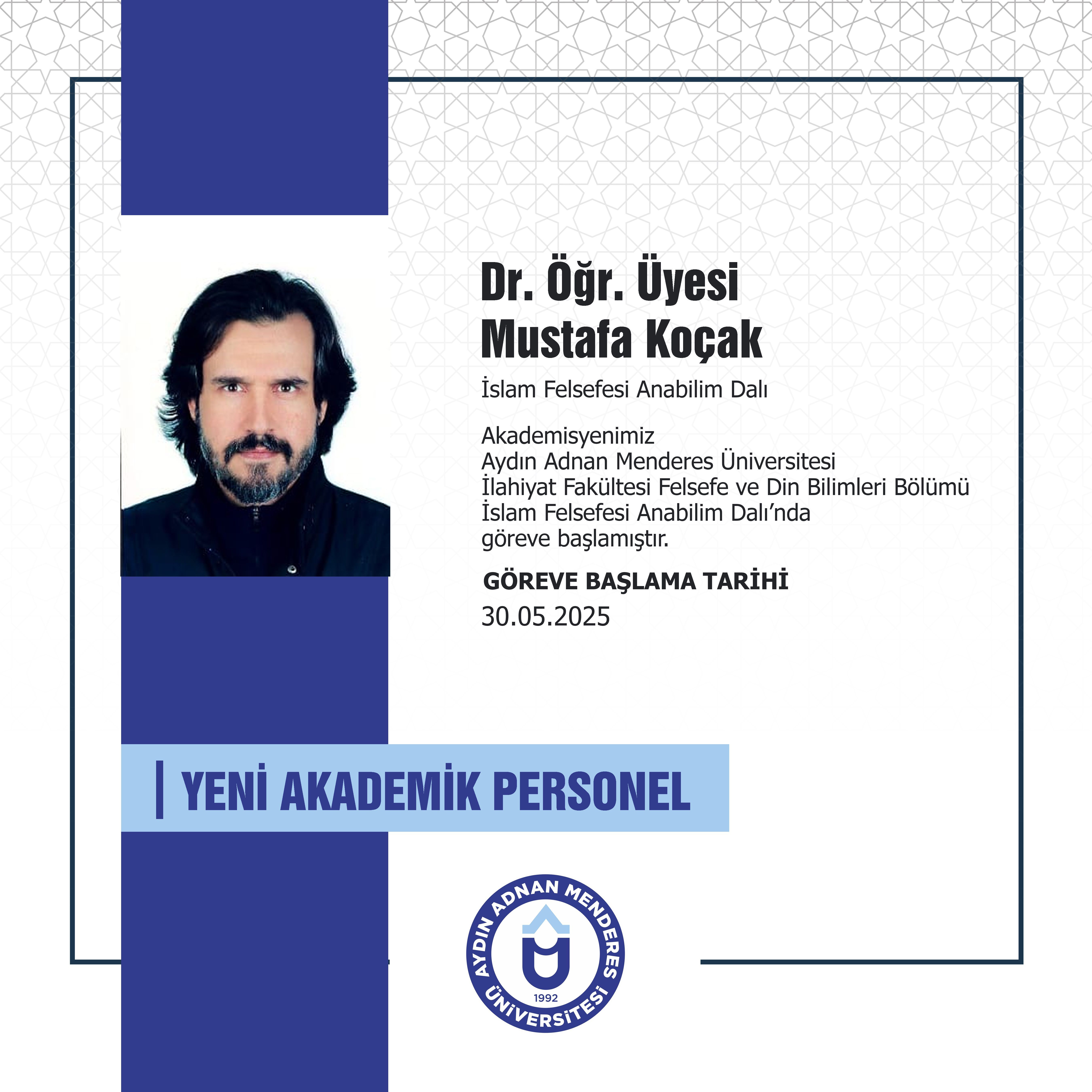 Yeni Akademik Personel - Dr. Öğretim Üyesi Mustafa Koçak