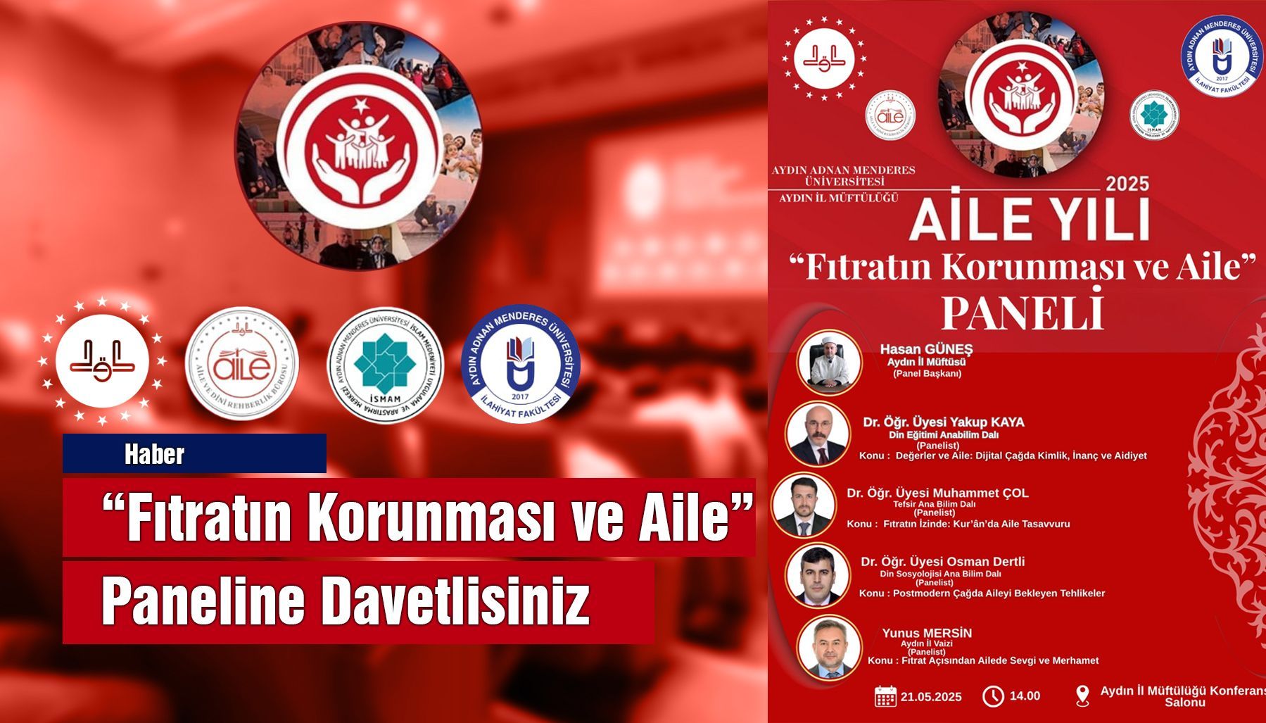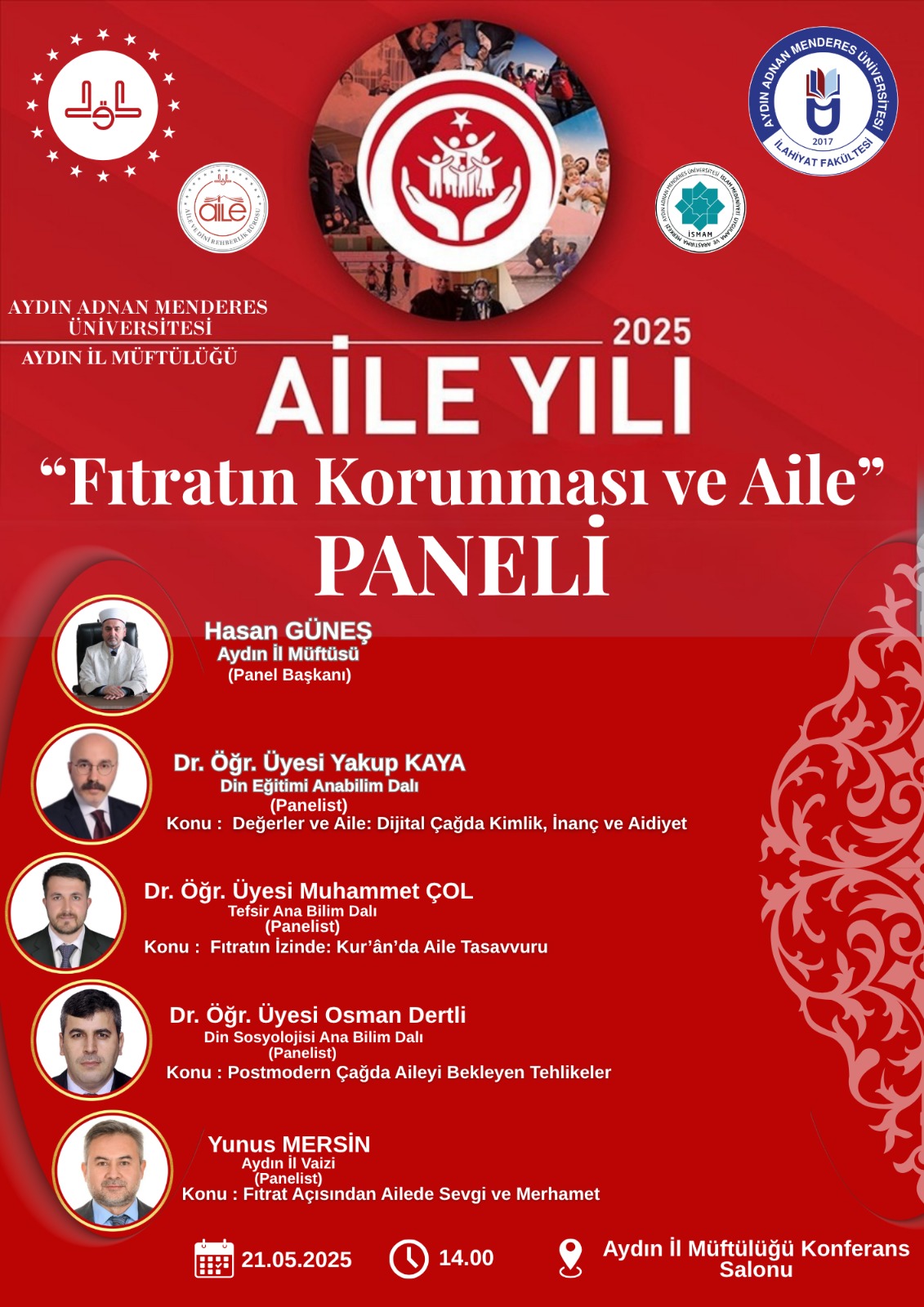 Aydın Adnan Menderes Üniversitesi ile Aydın İl Müftülüğü iş birliğinde, 2025 Aile Yılı etkinlikleri kapsamında düzenlenecek olan “Fıtratın Korunması ve Aile” Paneli, 21 Mayıs 2025 Çarşamba günü saat 14.00’te Aydın İl Müftülüğü Konferans Salonu’nda gerçekleştirilecektir.