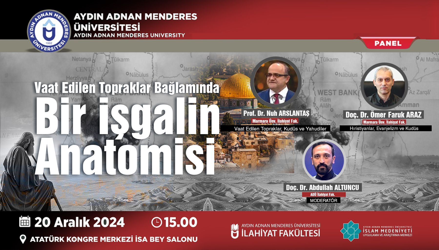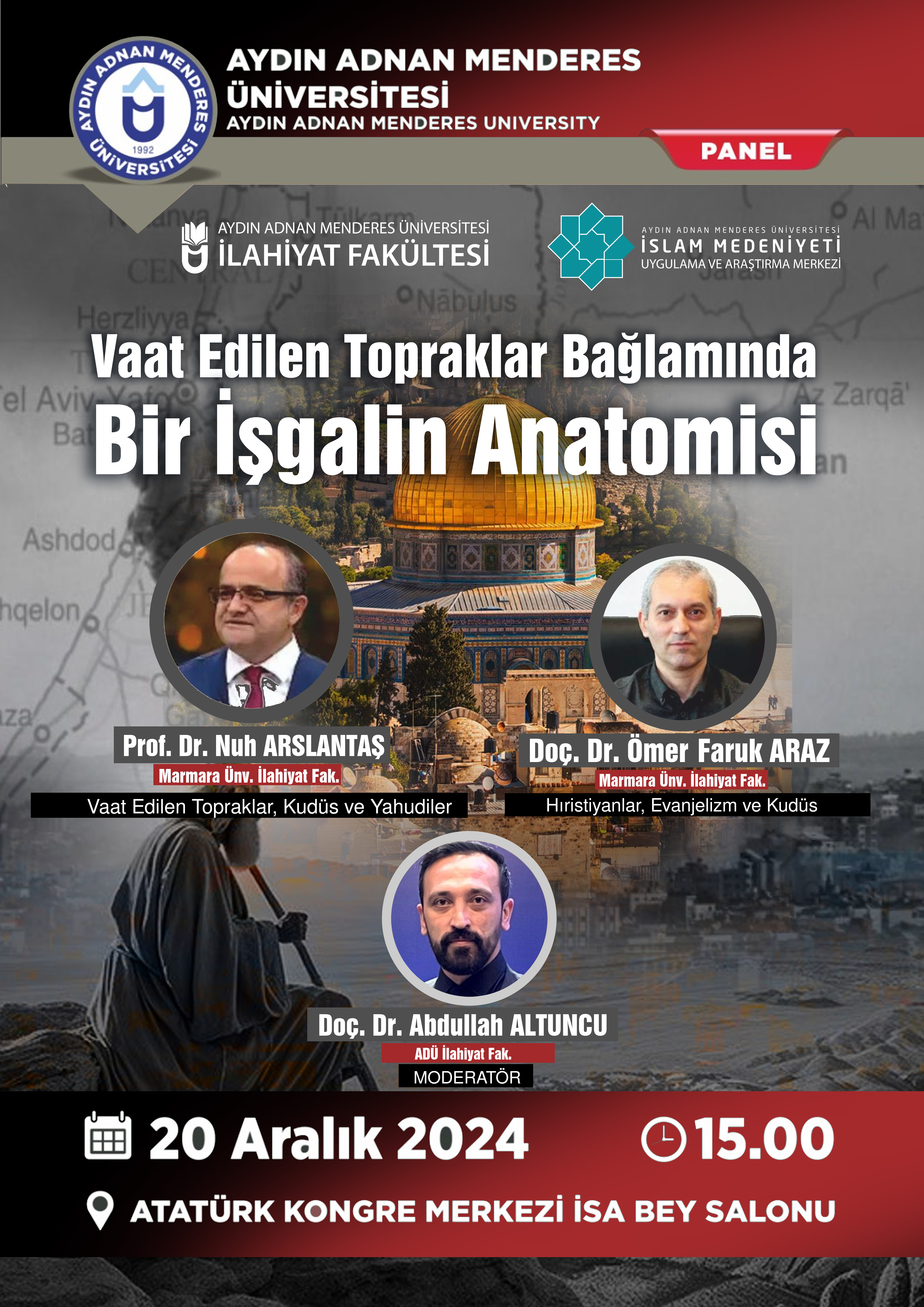 Fakültemiz ve İSMAM (İslam Medeniyeti Uygulama ve Araştırma Merkezi) işbirliği ile "Vaat Edilen Topraklar Bağlamında Bir İşgalin Anatomisi" başlıklı panel gerçekleştirilecektir. Panelimiz Marmara Üniversitesi İlahiyat Fakültesi öğretim üyesi hocalarımız Prof. Dr. Nuh Arslantaş ve Doç.Dr. Ömer Faruk Araz katılımıyla ve Fakültemiz öğretim üyelerinden Doç.Dr. Abdullah Altuncu hocamızın moderatörlüğünde 20 Aralık 2024 tarihinde Saat:15.00 da ADÜ Atatürk Kongre Merkezi İsa Bey Salonunda gerçekleştirilecektir. İlgi duyan herkesi panelimize davet ediyoruz.