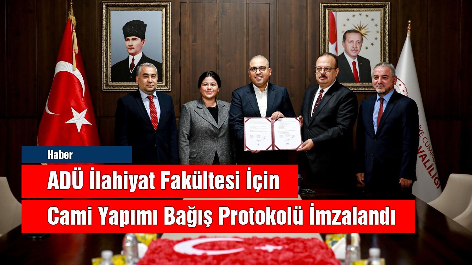 Aydın Valisi Yakup Canbolat’ın başkanlığında düzenlenen törende, Aydın Adnan Menderes Üniversitesi İlahiyat Fakültesi bünyesinde inşa edilecek cami için bir bağış protokolü imzalandı.