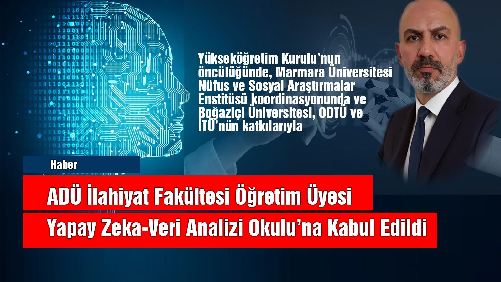 Aydın Adnan Menderes Üniversitesi İlahiyat Fakültesi öğretim üyesi Dr. Öğr. Üyesi İrfan Yiğit, Yükseköğretim Kurulu’nun öncülüğünde, Marmara Üniversitesi Nüfus ve Sosyal Araştırmalar Enstitüsü koordinasyonunda ve Boğaziçi Üniversitesi, ODTÜ ve İTÜ’nün katkılarıyla yürütülen Veri Analizi Okulu programına kabul edildi.