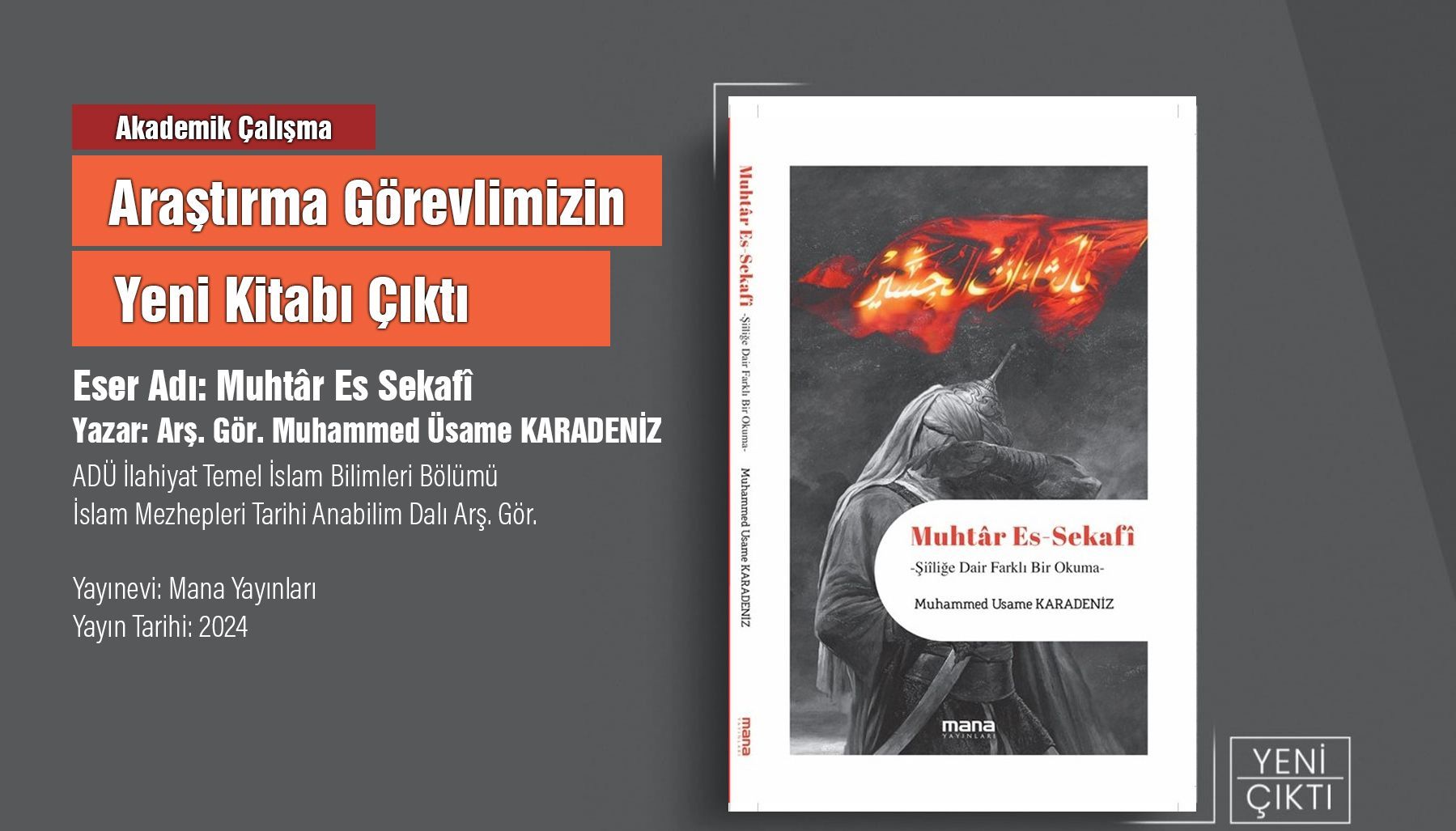 Fakültemiz Temel İslam Bilimleri Bölümü İslam Mezhepleri Tarihi Anabilim Dalı ArÅŸ. Gör. Muhammed Üsame Karadeniz'in Muhtâr Es-Sekafî (ÅžiiliÄŸe Dair Farklı Bir Okuma) isimli çalışması Mana Yayınları tarafından kitap olarak basıldı. ArÅŸ. Gör Muhammed Üsame Karadeniz'i yeni yayınından dolayı tebrik ediyoruz.