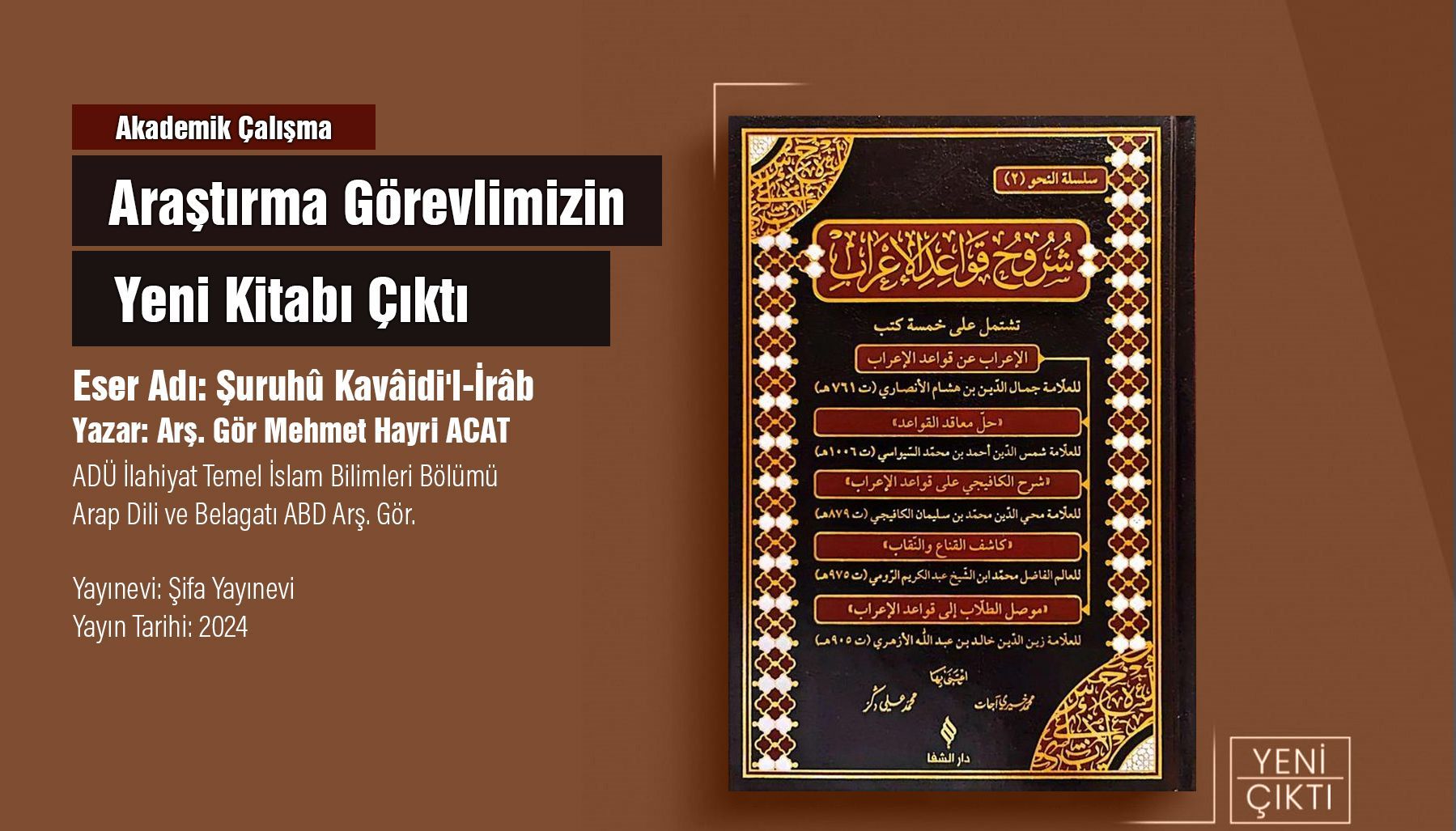 Fakültemiz Temel İslam Bilimleri Bölümü Arap Dili ve Belagatı ABD'da görev yapan ArÅŸ. Gör Mehmet Hayri ACAT'ın "Åžuruhû Kavâidi'l-İrâb" adlı eseri Åžifa Yayınevi tarafından basıldı. ArÅŸ. Gör Mehmet Hayri ACAT'ı yeni yayınından dolayı tebrik ederiz.