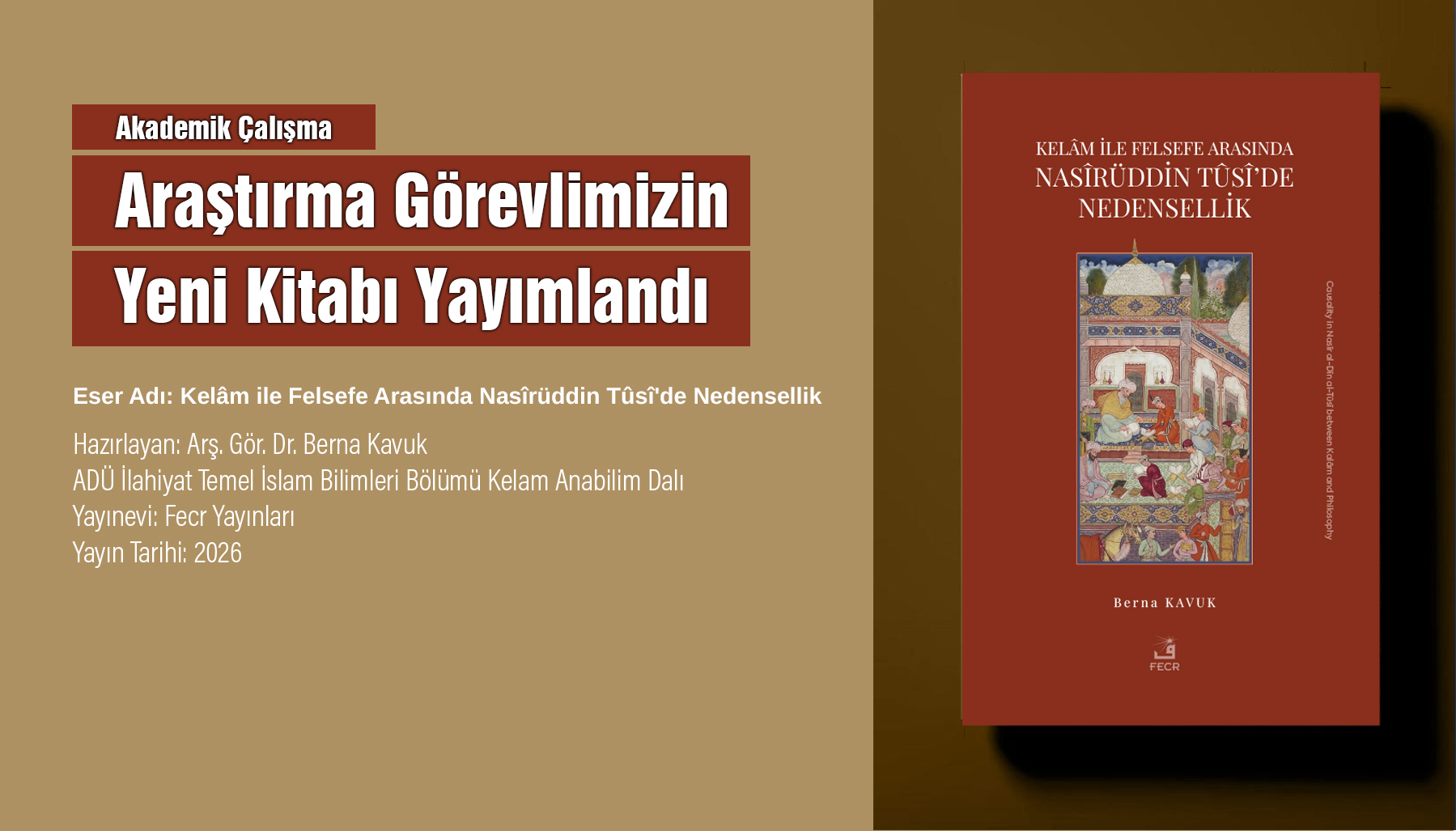Aydın Adnan Menderes Üniversitesi İlahiyat Fakültesi Temel İslam Bilimleri Bölümü Kelâm Anabilim Dalı öğretim elemanı Arş. Gör. Dr. Berna Kavuk’un “Kelâm ile Felsefe Arasında Nasîrüddin Tûsî’de Nedensellik” adlı eseri, Fecr Yayınları etiketiyle yayımlandı.
