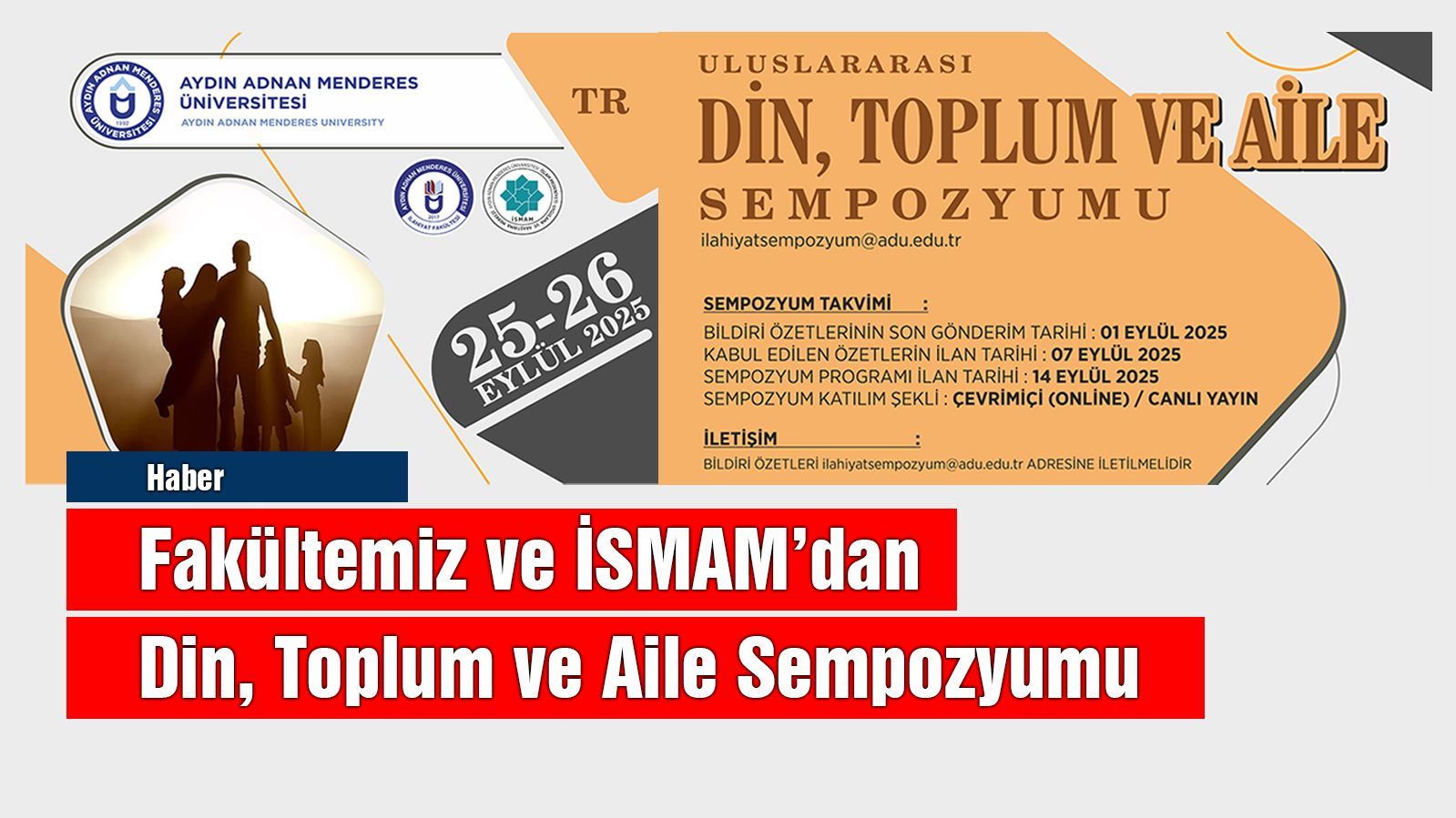 Aydın Adnan Menderes Üniversitesi İlahiyat Fakültesi ile İslami İlimler ve Medeniyet Araştırmaları Merkezi (İSMAM) iş birliğinde düzenlenecek olan Uluslararası Din, Toplum ve Aile Sempozyumu, 25-26 Eylül 2025 tarihlerinde çevrim içi olarak gerçekleştirilecek. Sempozyum, farklı disiplinlerden akademisyenleri bir araya getirerek dinî, toplumsal ve ailevi yapılar arasındaki etkileşimi çok boyutlu bir şekilde ele almayı hedefliyor.