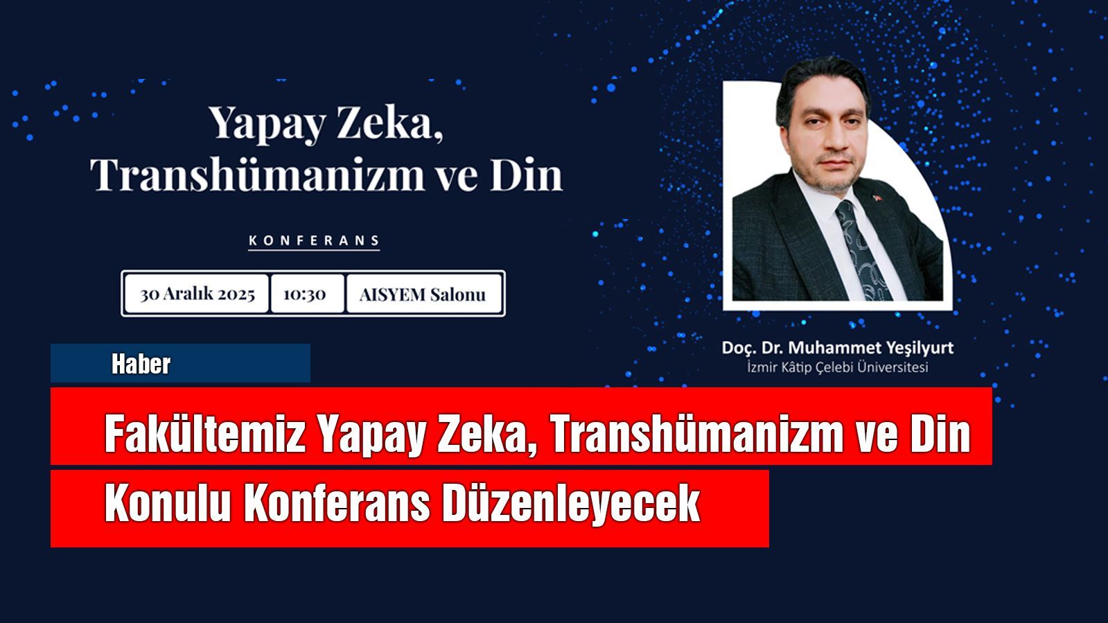 İzmir Kâtip Çelebi Üniversitesi öğretim üyesi Doç. Dr. Muhammet Yeşilyurt’un konuşmacı olarak katılacağı “Yapay Zekâ, Transhümanizm ve Din” başlıklı konferans, 30 Aralık 2025 tarihinde saat 10.30’da AISYEM Salonu’nda gerçekleştirilecek.