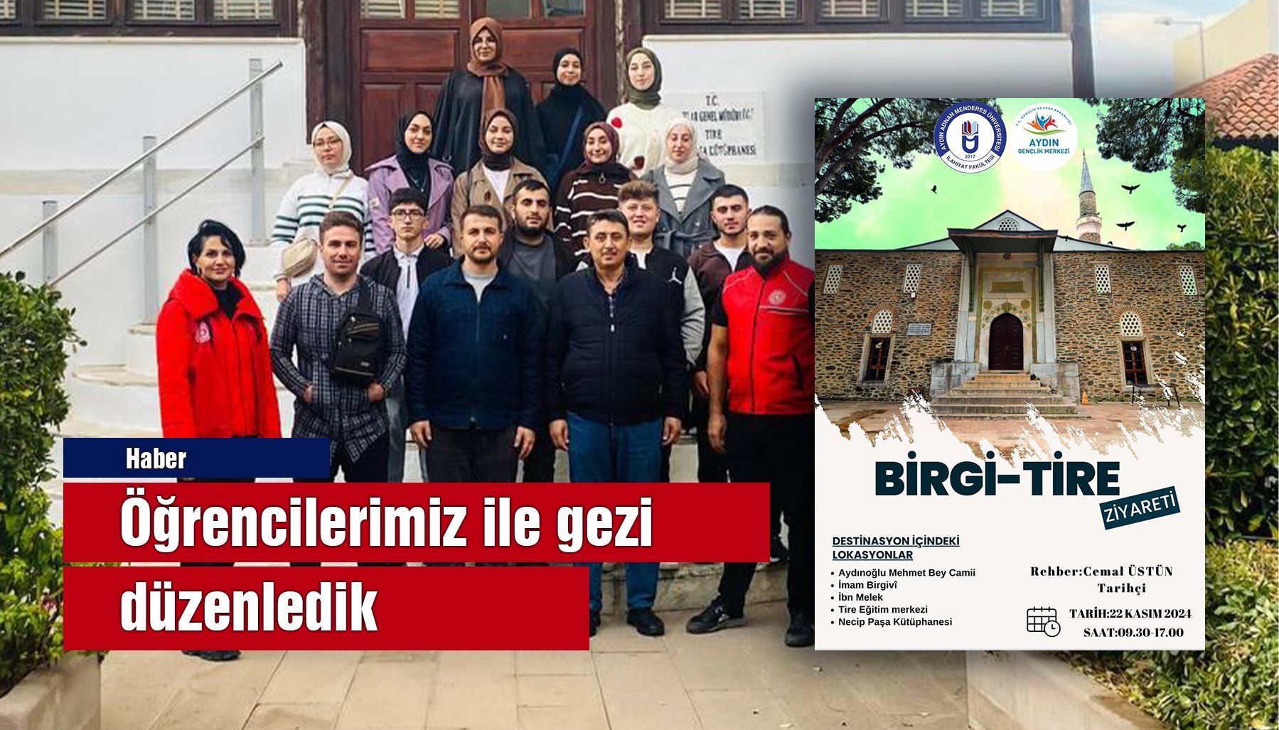 Fakültemiz öğrencilerine yönelik olarak T.C. Spor Bakanlığı Aydın Gençlik Merkezi ve Aydın İl Müftülüğü Diyanet Gençlik Merkezi Koordinatörlüğü işbirliği ile Tire-Birgi gezisi düzenledik. Gezi kapsamında Aydınoğlu Mehmet Bey Camii, İmam Birgivî ve İbn Melek'in kabirleri, Tire Eğitim merkezi, Necip Paşa Kütüphanesi gezildi. Fakülte olarak gezimize destek veren T.C. Spor Bakanlığı Aydın Gençlik Ofisi ve Aydın İl Müftülüğü Diyanet Gençlik Merkezi Koordinatörlüğüne teşekkür ediyoruz.