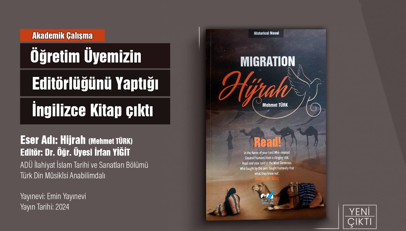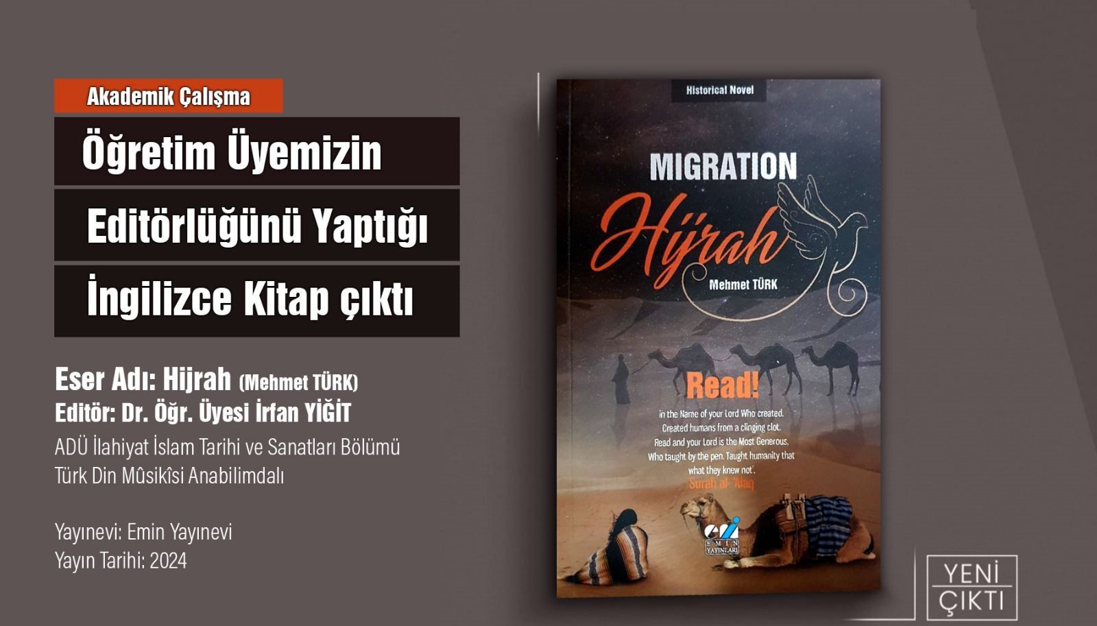 Fakültemiz İslam Tarihi ve Sanatları Bölüm Başkanı, Türk Din Musikisi Anabilimdalı Başkanı Dr. Öğr. Üyesi İrfan Yiğit'in editörlüğünü yaptığı Danimarka'da yaşayan yazar Mehmet Türk tarafından yazılan "Hijrah" isimli İngilizce kitap Emin Yayınevi tarafından yayınlandı. Kitabın yazarı Mehmet Türk ve editörü Dr. Öğr. Üyesi İrfan Yiğit hocamızı tebrik ederiz.