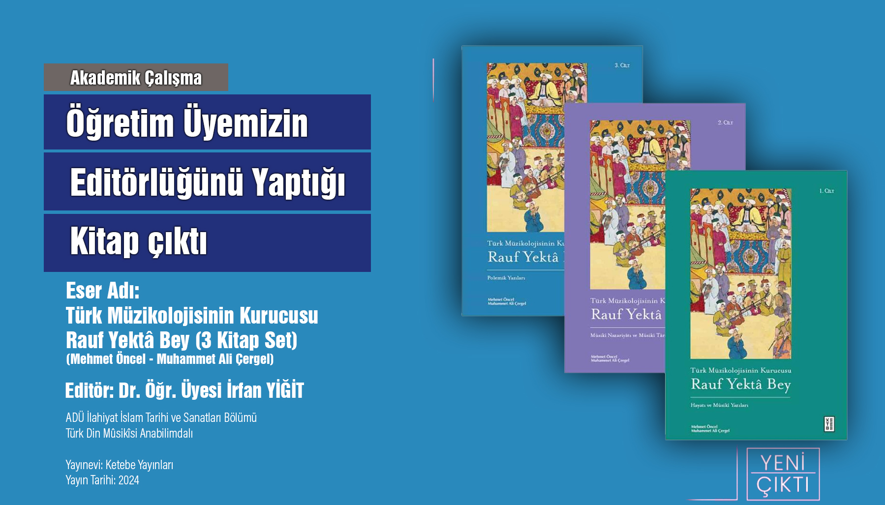 Fakültemiz İslam Tarihi ve Sanatları Bölüm Başkanı, Türk Din Musikisi Anabilimdalı Başkanı Dr. Öğr. Üyesi İrfan Yiğit'in editörlüğünü yaptığı "Türk Müzikolojisinin Kurucusu Rauf Yektâ Bey (3 Kitap Set) (Mehmet Öncel-Muhammet Ali Çergel)" isimli kitap Ketebe Yayınları tarafından yayınlandı. Kitabın yazarı Mehmet Öncel-Muhammet Ali Çergel ve editörü Dr. Öğr. Üyesi İrfan Yiğit hocamızı tebrik ederiz.