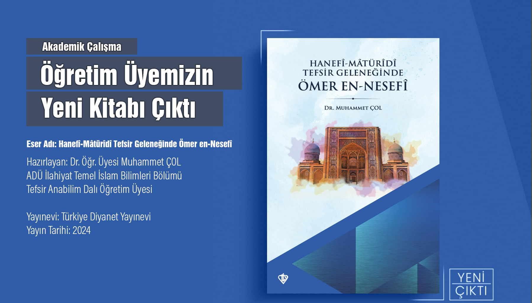 Fakültemiz Tefsir Anabilim Dalı'nda ÖÄŸretim Üyesi olan Muhammet ÇOL'un "Hanefî-Mâtürîdî Tefsir GeleneÄŸinde Ömer en-Nesefî" isimli kitabı Türkiye Diyanet Vakfı Yayınları tarafından basıldı. Dr. ÖÄŸr. Üyesi Muhammet ÇOL'u yeni yayınından dolayı tebrik ediyoruz.