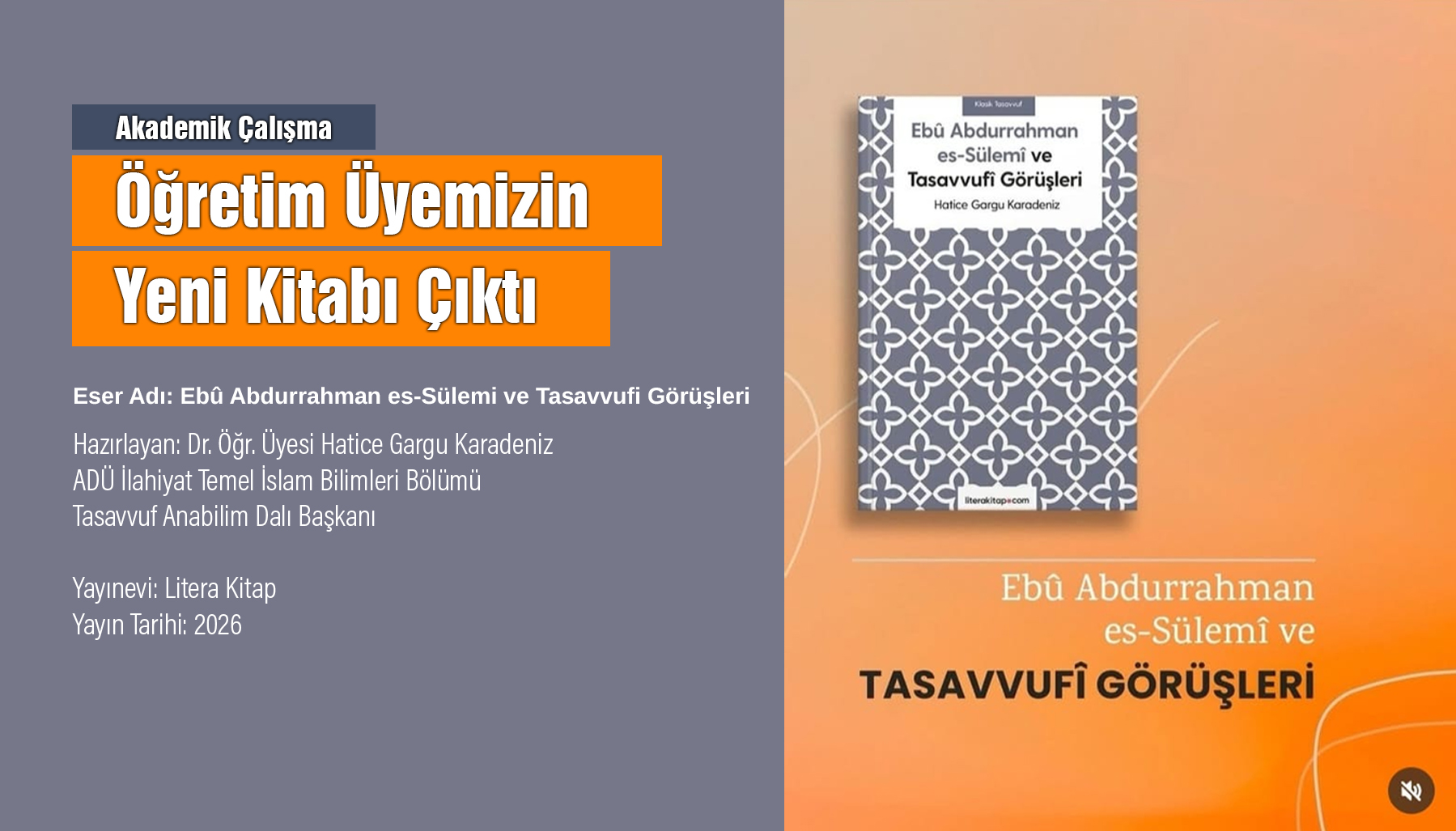 Litera Kitap Yayınları tarafından 2026 yılında yayımlanan eser, tasavvuf alanında yapılan akademik çalışmalara önemli bir katkı sunmaktadır. ÖÄŸretim üyemizi bu kıymetli çalışmasından dolayı tebrik eder, akademik baÅŸarılarının devamını dileriz.