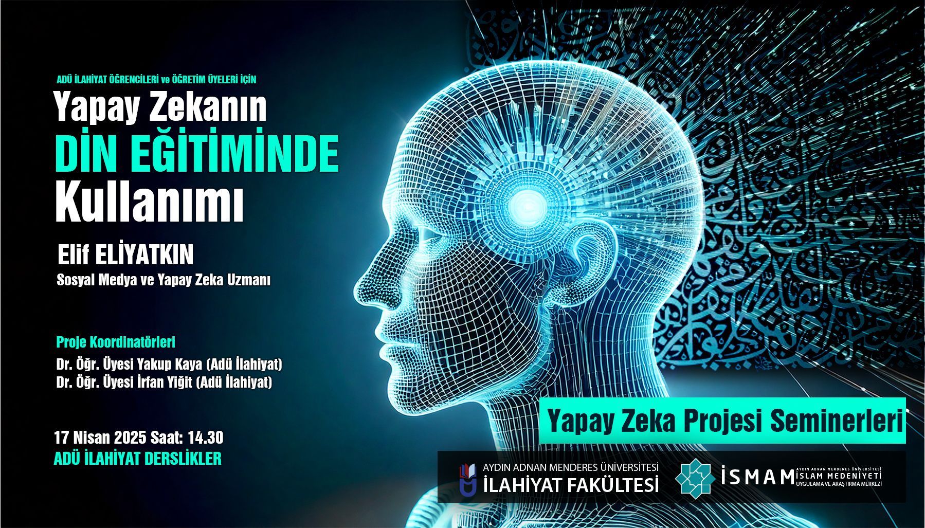 Aydın Adnan Menderes Üniversitesi İlahiyat Fakültesi ile İslam Medeniyeti Uygulama ve Araştırma Merkezi (İSMAM) iş birliğinde düzenlenen “Yapay Zekânın Din Eğitiminde Kullanımı” başlıklı seminer, 17 Nisan 2025 Perşembe günü saat 14.30’da ADÜ İlahiyat Fakültesi dersliklerinde gerçekleştirilecektir.