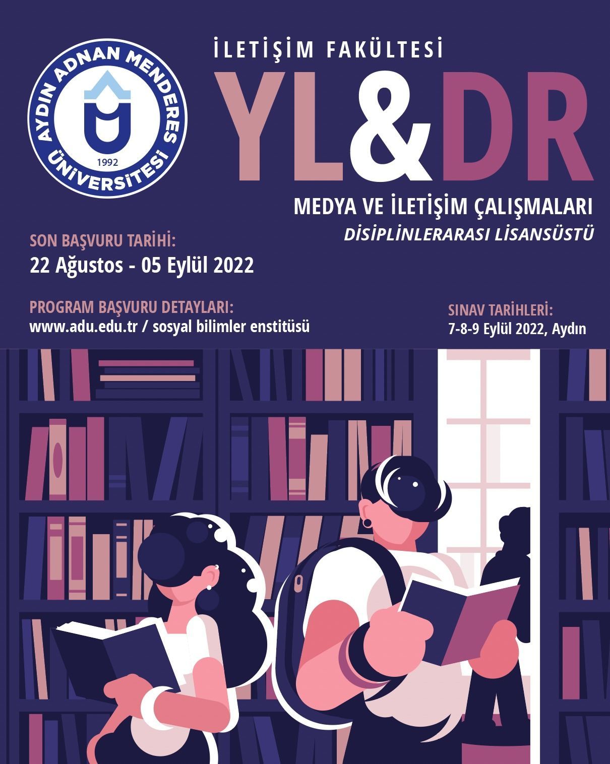 Aydın Adnan Menderes Üniversitesi, İletişim Fakültesi Medya ve İletişim Çalışmaları disiplinlerarası yüksek lisans ve doktora programları adaylarını bekliyor. Başvurular 22 Ağustos - 5 Eylül 2022 tarihleri arasında, sakın kaçırmayın! Detaylı bilgi ve başvuru süreci için, ADÜ Sosyal Bilimler Enstitüsü web sayfasınını ziyaret edin.