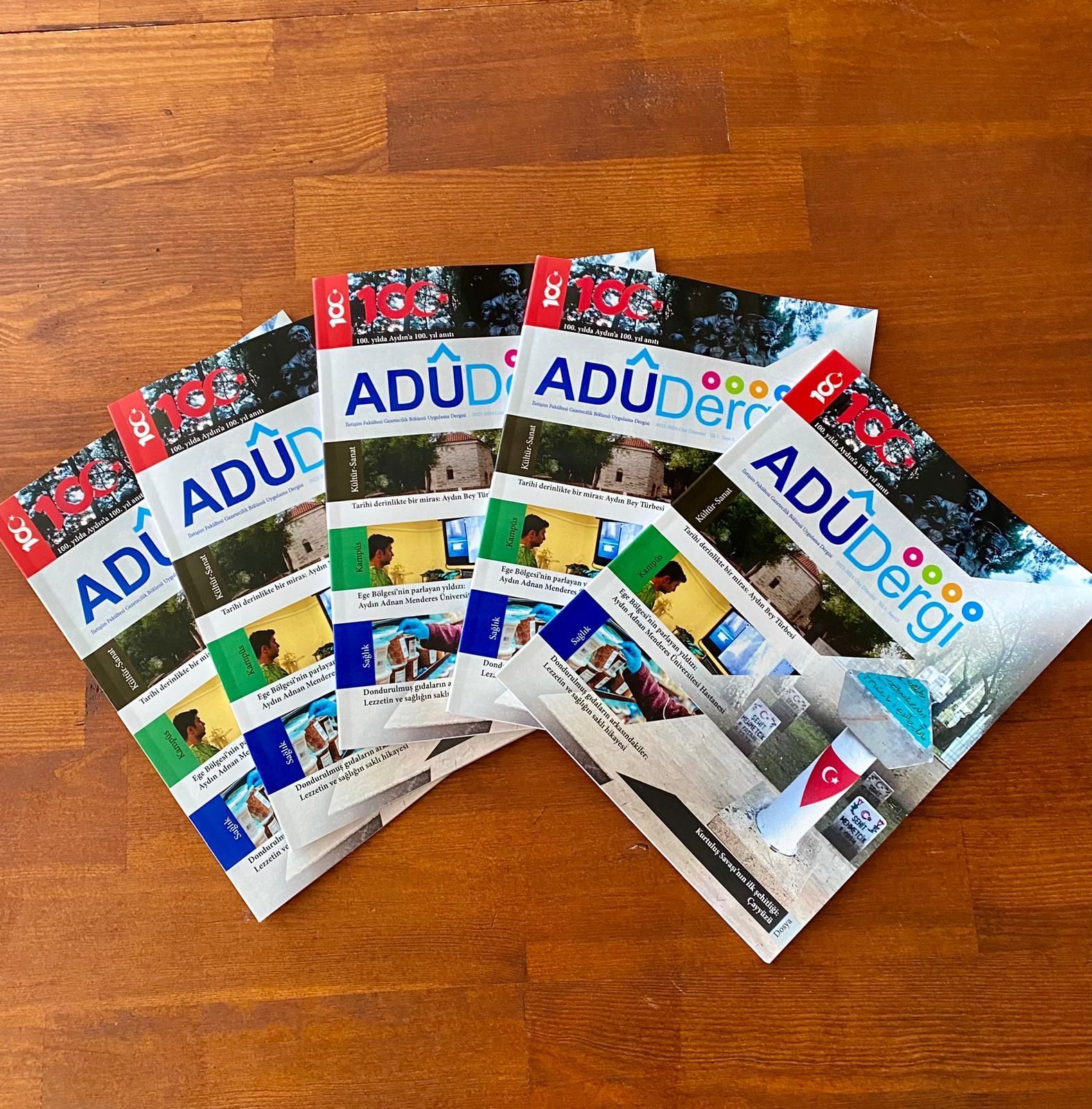 Gazetecilik Bölümü son sınıf öğrencilerinin ders kapsamında yapmış olduğu haberlerin yayımlandığı ADÜ Dergi’nin beşinci sayısının ana temasını Türkiye Cumhuriyeti’nin 100. Yılı oluşturdu. “100. Yılda Aydın’a 100. Yıl Anıtı” haberi sür manşetten verilirken 100. Yıl Anıtı’nın yapılış hikayesi ve anlamları anlatıldı. Ayrıca “Kurtuluş Savaşı’nın İlk Şehitliği: Çayyüzü” ve “Tarihi Derinliklerde Bir Miras: Aydın Bey Türbesi” haberleri kapak sayfasından verildi.