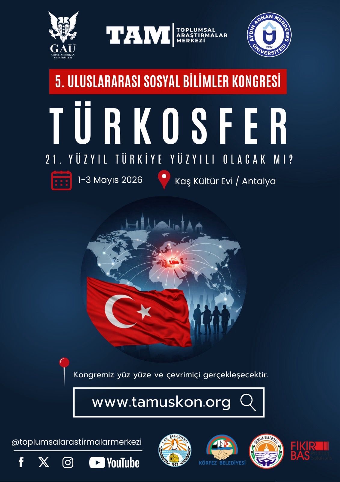 Aydın Adnan Menderes Üniversitesi (ADÜ), Girne Amerikan Üniversitesi ve Toplumsal Araştırmalar Merkezinin (TAM) düzenleme kurulunda bulunduğu 5. Uluslararası Sosyal Bilimler Kongresi 1-3 Mayıs 2026 tarihlerinde düzenlenecek. TAM 5. Uluslararası Sosyal Bilimler Kongresi, “Türkosfer: 21. Asır Türkiye Yüzyılı Olacak mı?” ana temasıyla Antalya’nın Kaş ilçesinde toplanacak. Fakültemizin düzenleyici paydaş olarak merkezinde yer aldığı bu prestijli kongre, Türkiye’nin küresel ve bölgesel rolünü bilimsel bir zeminde tartışmaya açacak. Kongrenin “Kongre Başkanı” görevini İletişim Fakültesi Dekanı Prof. Dr. Mustafa Yılmaz üstlenirken; Dekan Yardımcısı Dr. Öğr. Üyesi Mustafa Gökmen ise “Kongre Başkan Yardımcısı” olarak süreci yönetecek. Organizasyonun Düzenleme Kurulu’nda ise Dekan Yardımcısı Prof. Dr. Ali Emre Dingin ile birlikte fakültemiz bünyesinde görev yapan öğretim elemanları ve araştırmacılar aktif görev alıyor.