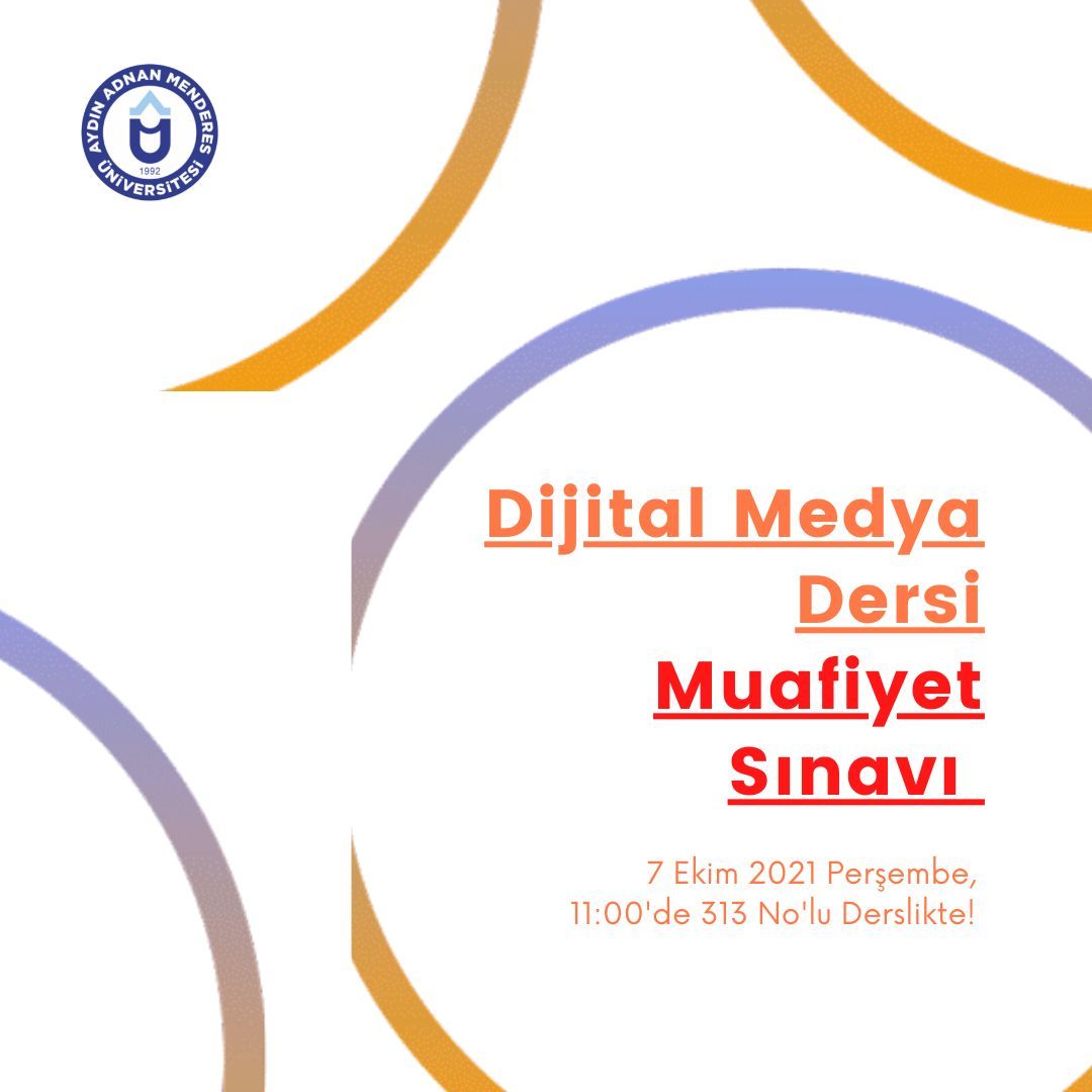Dijital Medya Dersi Muafiyet Sınavı, 7 Ekim 2021 saat 11:00'de 313 no'lu derslikte gerçekleştirilecektir. Duyurulur.