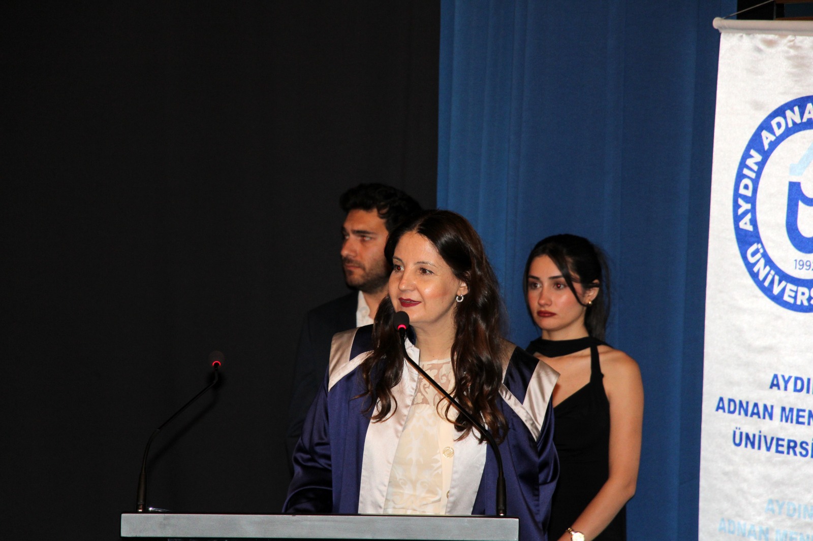 Saygı DuruÅŸu ve İstiklal Marşı’nın okunmasının ardından İletiÅŸim Fakültesi tanıtım filmi izletildi. Törende açılış konuÅŸmasını yapan İletiÅŸim Fakültesi Dekanı Prof. Dr. Hatice Hale Bozkurt, mezun olan genç iletiÅŸimcilerin geleceÄŸin kültür mimarları ve mühendisleri olacağını söyledi. Prof. Dr. Bozkurt, “YolculuÄŸunuzun en önemli kısmı ÅŸimdi baÅŸlıyor. Bundan sonra iÅŸ hayatınızda ve sosyal yaÅŸantınızda Aydın Adnan Menderes Üniversitesi İletiÅŸim Fakültesinin temsilcisi olacaksınız. Bir kısmınız kamuda ya da özel sektörde mesleki geliÅŸime kendini verecek bir kısmınız ise bizler gibi iletiÅŸimin bilimsel akışını ve ilerleyiÅŸini yönlendirmeyi amaçlayarak mesleÄŸinizi geliÅŸtirmek için çalışacaksınız. Ancak nereye giderseniz gidin, iletiÅŸim etiÄŸi ve özellikle insani ilkelerine baÄŸlı çalışın.” dedi.