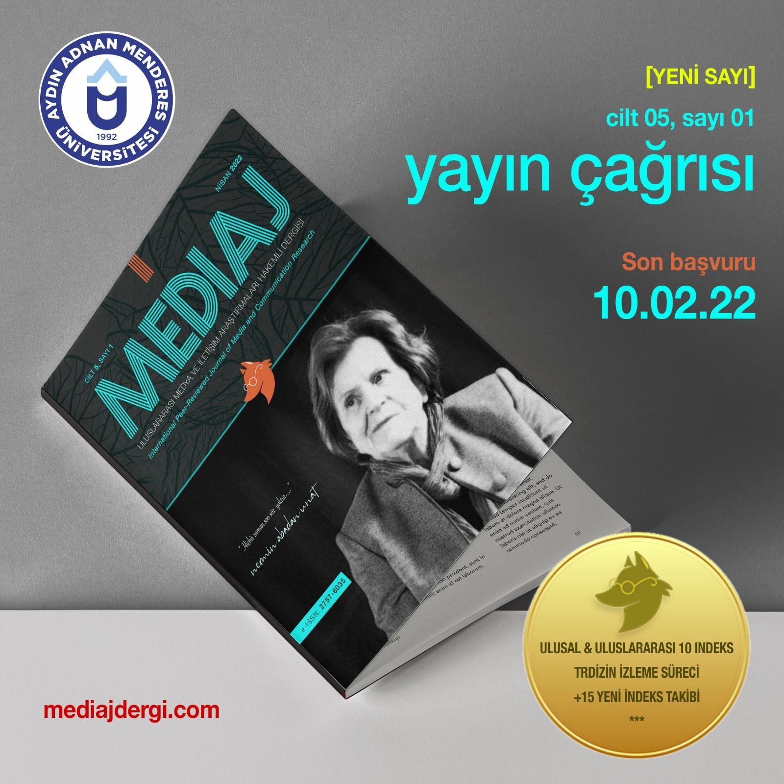 Üniversitemiz Rektörü Prof. Dr. Osman Selçuk Aldemir'in bilimsel seferberlik başlığı altında başlattığı, bilimsel üretimde kalitenin arttırılması ve akademik üretimin iyileştirilmesi hedefleri doğrultusunda İletişim Fakültesi hakemli dergisi MEDIAJ’ın genişleyen ulusal ve uluslararası veritabanı ve indeks ağı ile gelişim sürecini sürdürüyor.