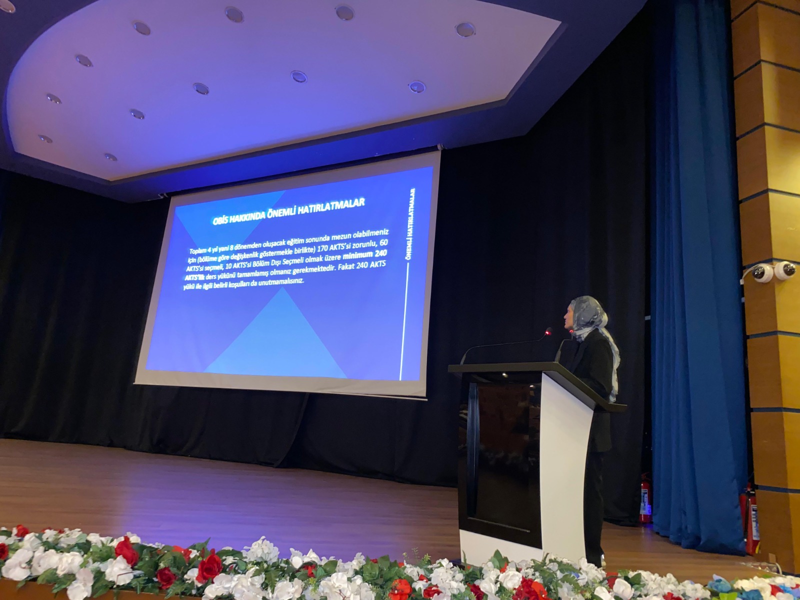 ArÅŸ. Gör. Neslihan Erdem ve ArÅŸ. Gör. Kudret Akın Toker’in sunumuyla öÄŸrencilere lisans ve lisansüstü eÄŸitimi hakkında bilgi verildi. ÖÄŸrenci Bilgi Sistemi (OBİS)’nin nasıl kullanılacağı hakkında açıklamalar yapıldı. Ayrıca fakültenin baÄŸlı olduÄŸu yönetmelik ve yönergeler açıklanarak devamsızlık ve akademik takvimin önemi anlatıldı. Erasmus ve Farabi gibi öÄŸrenci deÄŸiÅŸim programlarının tanıtıldığı program öÄŸrencilerin sorularının yanıtlanmasıyla tamamlandı.