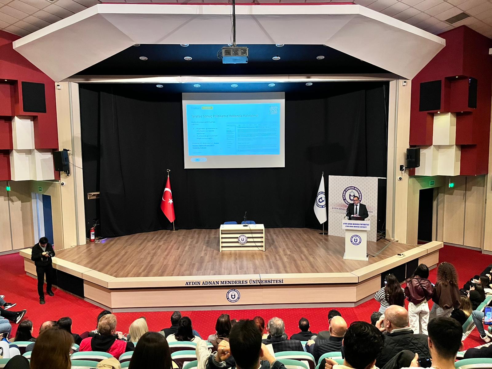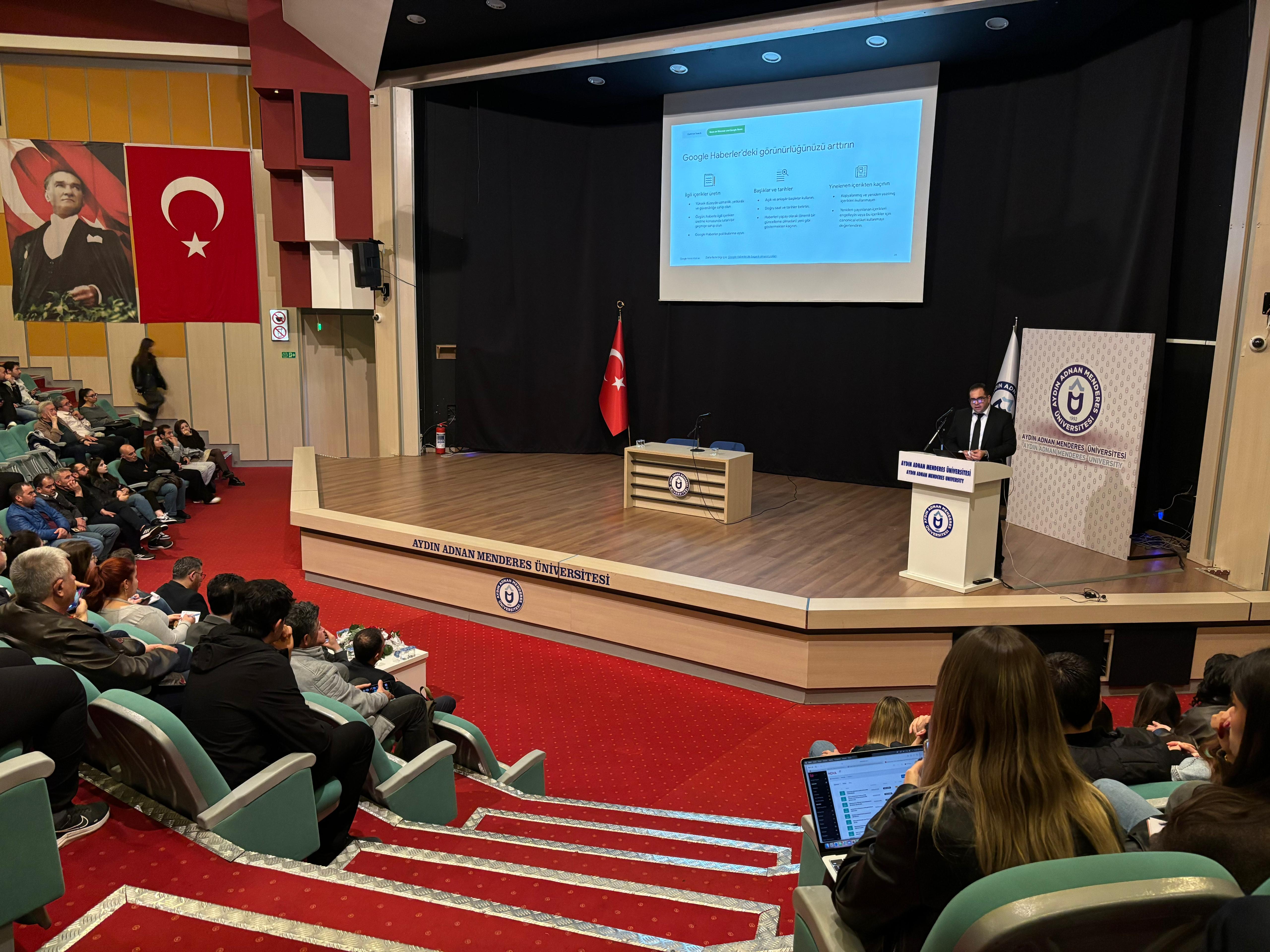 Aydın Adnan Menderes Üniversitesi (ADÜ) İletişim Fakültesi ev sahipliğinde, Aydın Büyükşehir Gazeteciler Cemiyeti (ABGC) iş birliği ile düzenlenen Google Haber İnisiyatifi (GNI) Dijital ve Yapay Zekâ Okuryazarlığı Eğitimi, 25 Mart 2026 Çarşamba günü saat 14.00’te ADÜ Atatürk Kongre Merkezi Aydın Bey Salonu’nda gerçekleşti. Eğitmen Özgür Mehmet Kütküt tarafından yürütülen eğitim programı, ADÜ İletişim Fakültesi Dekan Prof. Dr. Mustafa Yılmaz, Dekan Yardımcıları Prof. Dr. Ali Emre Dingin ve Dr. Öğr. Üyesi Mustafa Gökmen, Aydın Büyükşehir Gazeteciler Cemiyeti Başkanı Ümit Özmen ve yönetim kurulu üyeleri ile birlikte çok sayıda akademisyen ve öğrencinin katılımıyla düzenlendi.