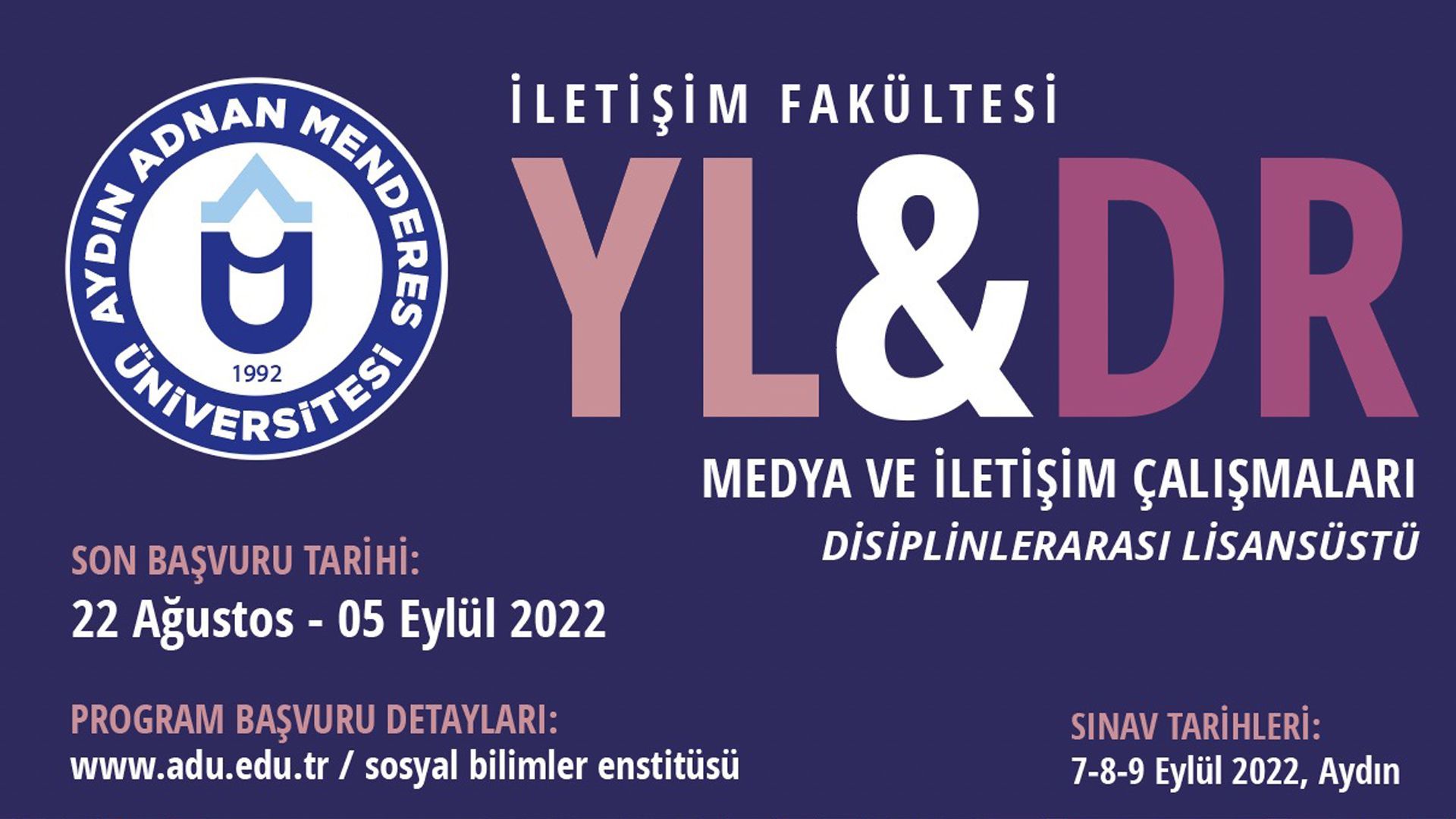 Aydın Adnan Menderes Üniversitesi, İletiÅŸim Fakültesi Medya ve İletiÅŸim Çalışmaları disiplinlerarası yüksek lisans ve doktora programları adaylarını bekliyor. BaÅŸvurular 22 AÄŸustos - 5 Eylül 2022 tarihleri arasında, sakın kaçırmayın! Detaylı bilgi ve baÅŸvuru süreci için, ADÜ Sosyal Bilimler Enstitüsü web sayfasınını ziyaret edin.