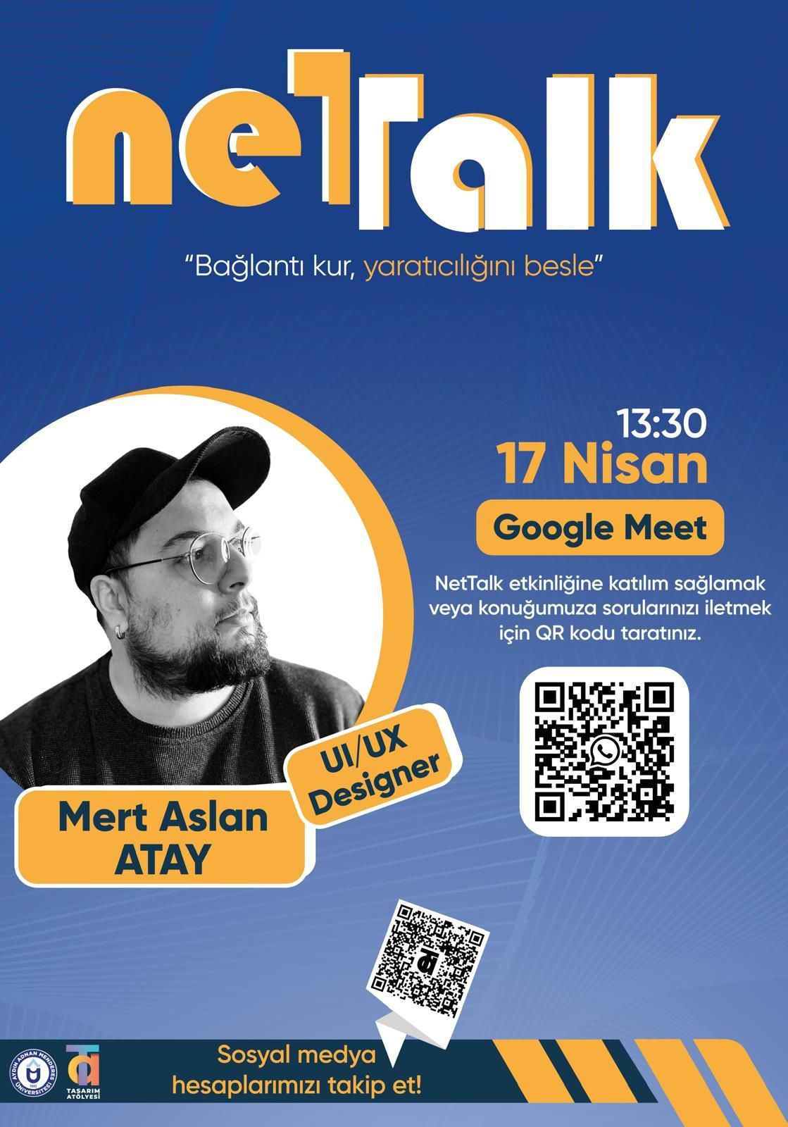 Dr. ÖÄŸr. Üyesi Taner KIZILHAN’ın kordinotörlüÄŸün deki Tasarım Atölyesinin düzenli olarak her hafta gerçekleÅŸtirilen Net-Talk etkinliÄŸi ile sektörde faaliyet gösteren profesyonelleri ve öÄŸrencileri dijital platformda bir araya getiriyor. Bu hafta, sektörde tanınmış bir isim olan UI/UX Designer Mert Aslan Atay, dönemin ilk konuÄŸu olarak katılım saÄŸlayacak. Atölye, öÄŸrencilere sektördeki tecrübeleri ve güncel trendleri aktarma amacıyla önemli bir platform saÄŸlıyor. ÖÄŸrenciler, bu etkinlik sayesinde kiÅŸilerin deneyimlerinden ilham almanın yanı sıra, sorular yönelterek sektör hakkında bilgi edinebiliyorlar.