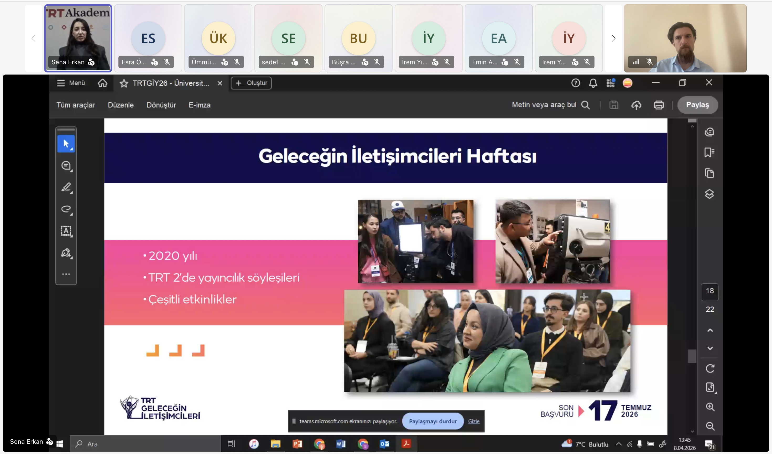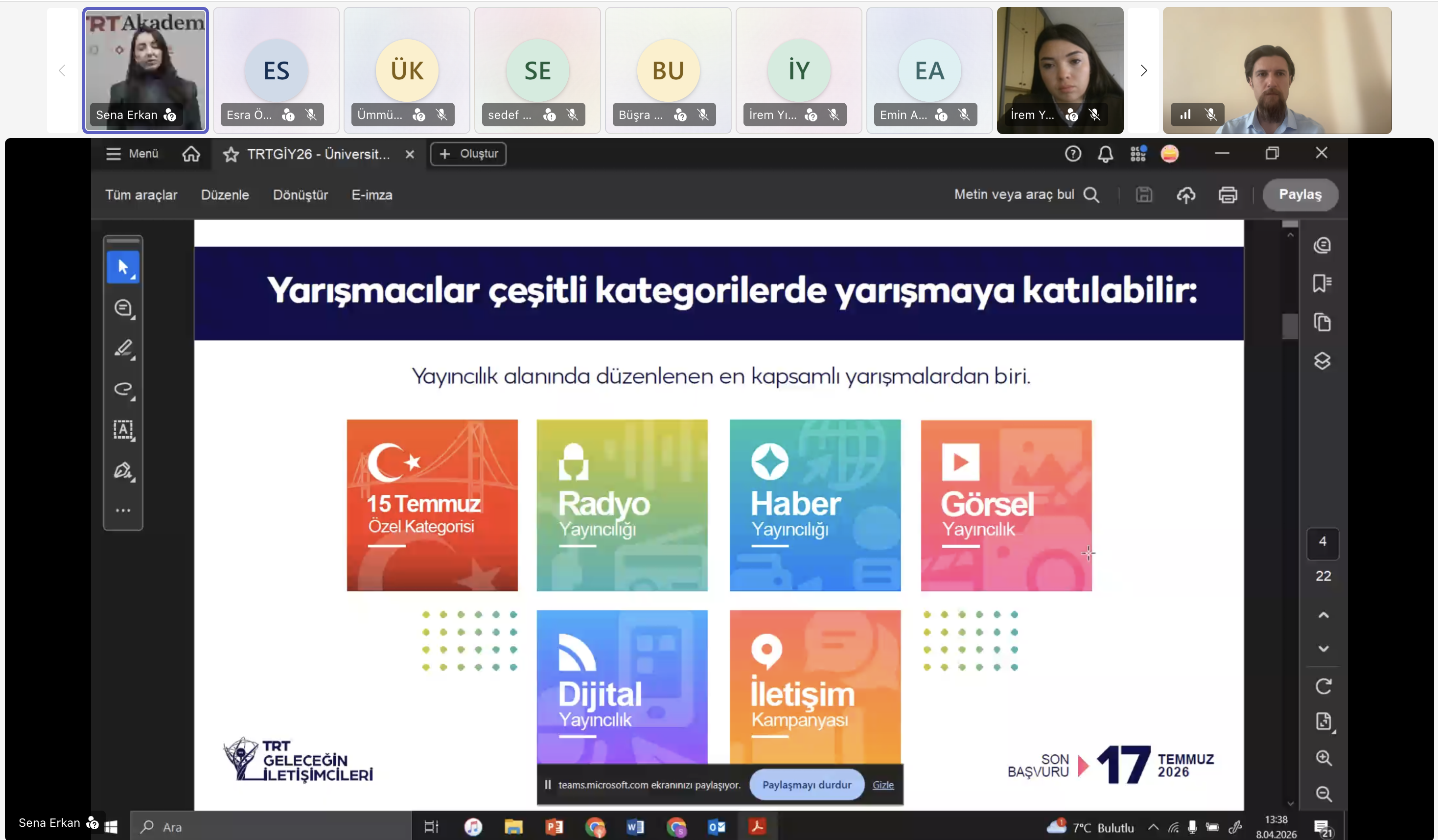 8 Nisan 2026 Çarşamba günü saat 13.30’da Microsoft Teams üzerinden yapılan etkinliğe, yarışma organizasyon koordinatörü Nurten Erdem ve ekibinin yanı sıra TRT’de yarışma sürecini doğrudan yöneten ve yarışmanın sunuculuğunu üstlenen yetkililer de katıldı.
