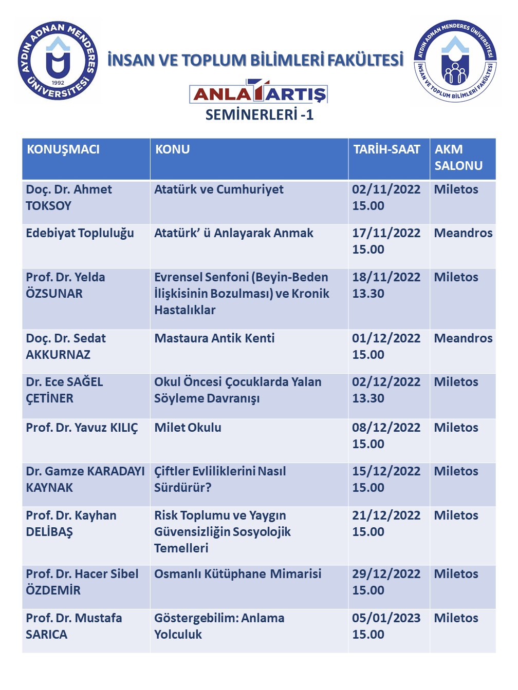 İlki 2 Kasım 2022 tarihinde düzenlenen Anlat-Tartış Seminerleri-1 2022-2023 Güz Dönemi boyunca devam edecek olup Üniversitemizin bütün personeline ve öğrencilerine açıktır.