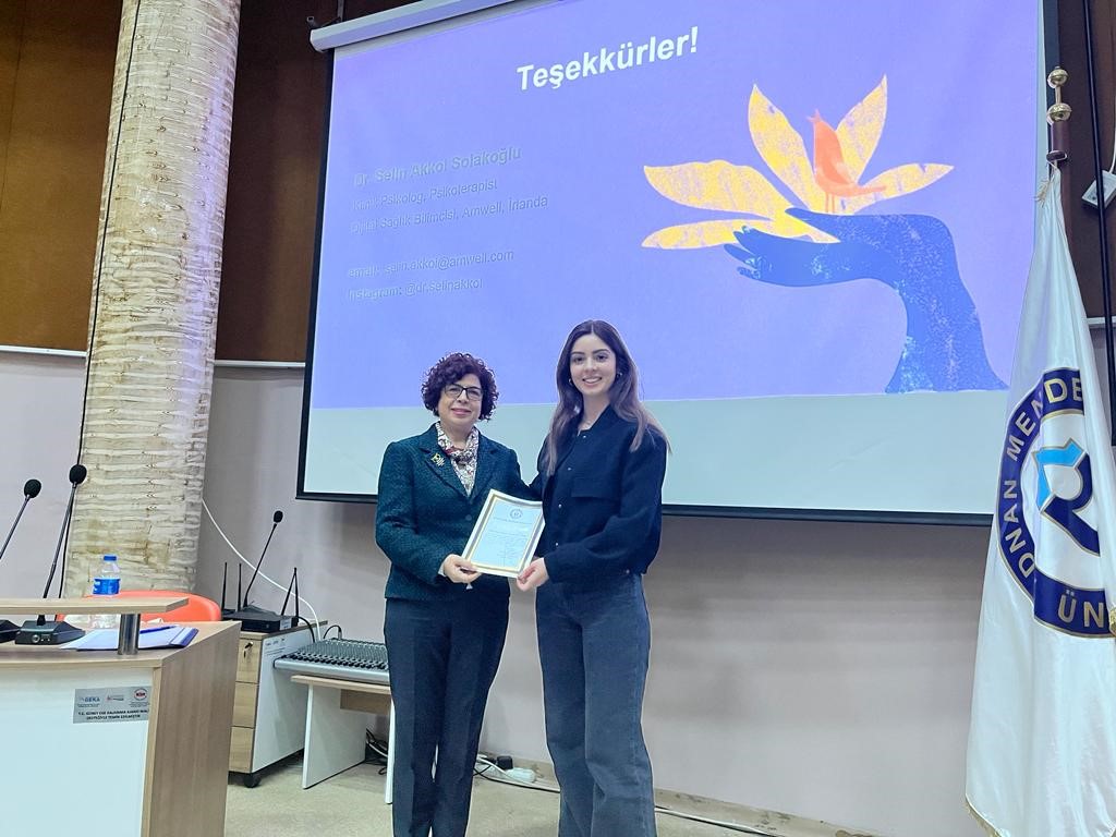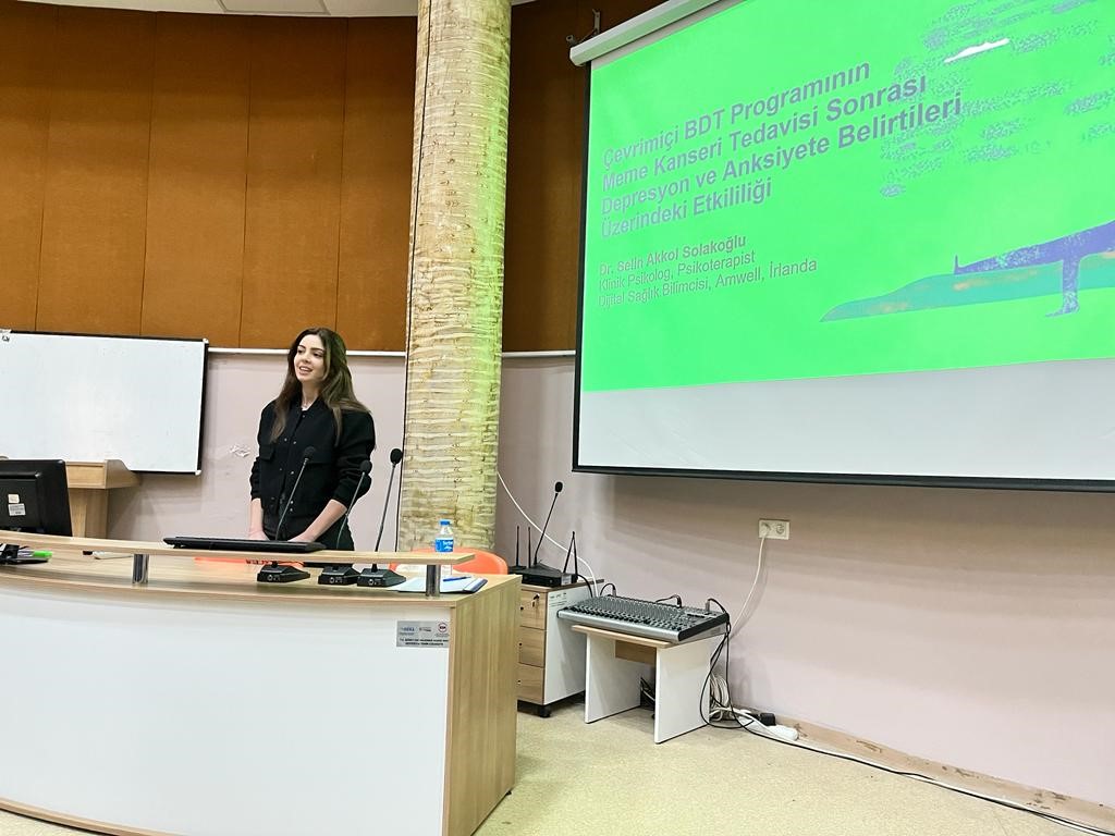 İnsan ve Toplum Bilimleri Fakültesi Psikoloji Bölümü tarafından düzenlenen seminerlerin üçüncüsü 24 Kasım 2023 Cuma günü AİSYEM Salonunda gerçekleÅŸtirildi. Etkinlik kapsamında, çalışmalarını İrlanda’da sürdüren Klinik Psikolog Dr. Selin Akkol SolakoÄŸlu "Çevrimiçi BiliÅŸsel-Davranışçı Terapi Programının Meme Kanseri Tedavisi Sonrası Depresyon ve Anksiyete Belirtileri Üzerindeki EtkililiÄŸi" baÅŸlıklı bir seminer verdi. Dr. Akkol SolakoÄŸlu, meme kanseri hastalarına uygulamış olduÄŸu çevrimiçi psikolojik müdahale programını tanıttı ve bu programın etkililiÄŸiyle ilgili katılımcılara bilgi verdi. Psikoloji Bölümü öÄŸretim üyelerinin ve öÄŸrencilerinin katıldığı seminer soru-cevap bölümünün ardından sona erdi.