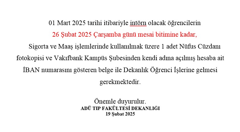 01 Mart'ta intörn olacak öğrencilerin dikkatine