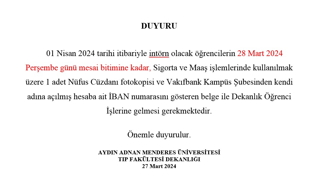 01 Nisan 2024 tarihinde intörn olacak öğrencilerin dikkatine