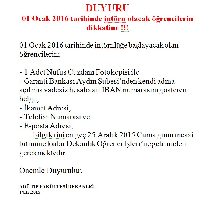 01 Ocak 2016 tarihinde intörn olacak öğrencilerin dikkatine !!!