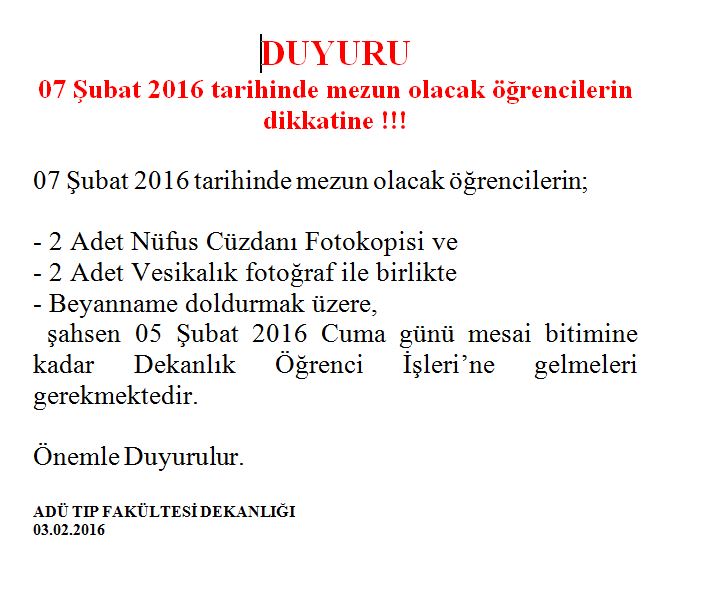 07.02.2016 Tarihinde Mezun Olacak Öğrencilerin Dikkatine..!!