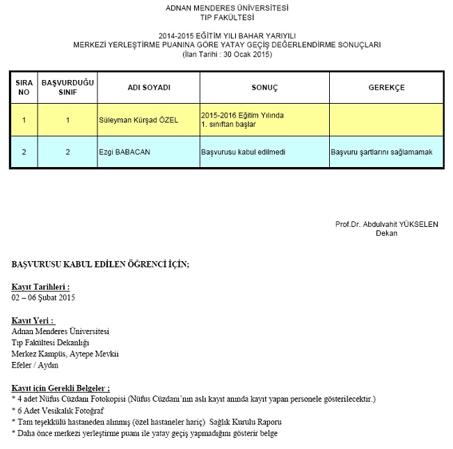 2015-2015 EĞİTİM YILI BAHAR YARI YILI MERKEZİ YERLEŞTİRME PUANINA GÖRE YATAY GEÇİŞ DEĞERLENDİRME SONUÇLARI