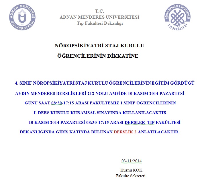 4. SINIF NÖROPSİKİYATRİ STAJ KURULU ÖĞRENCİLERİNİN DİKKATİNE