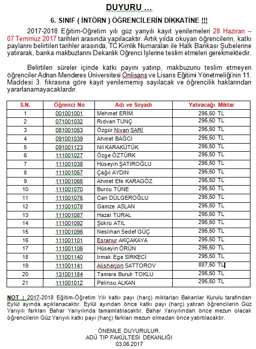 6. Sınıf Katkı Payı (Harç) Duyurusu