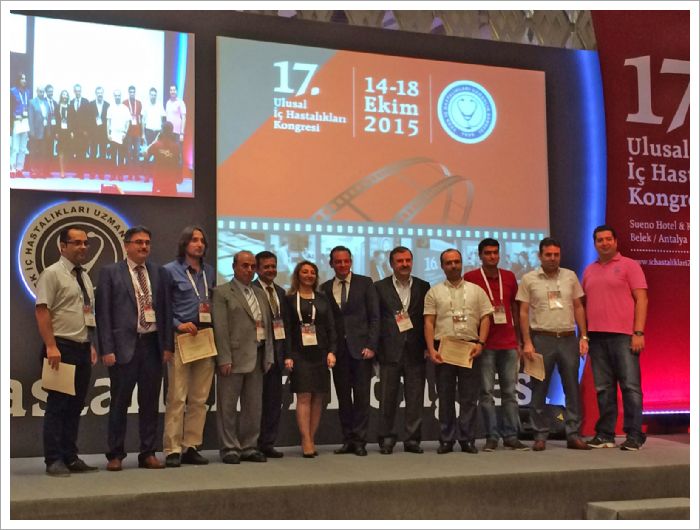 Fakültemiz İç Hastalıkları Anabilimdalı Endokrinoloji ve Metabolizma Hastalıkları Bilim Dalı ile Veteriner Fakültesi Patoloji ve Biyokimya Anabilim Dallarının birlikte yürüttüğü ADÜ Bilimsel Araştırma Projeleri Merkezi (BAP) tarafından proje desteği sağlanan “Hipotroidizm Modeli Oluşturulmuş Ratlarda Alkolik Olmayan Yağlı Karaciğer Hastalığı Gelişiminin Değerlendirilmesi” isimli çalışma, 14-18 Ekim 2015 tarihleri arasında 17. Ulusal İç Hastalıkları Kongresinde sözlü bildiri olarak sunulmuş, çalışma, kongrede sunulan toplam 440 bildiri arasında En İyi Deneysel Araştırma Ödülü’nü kazanmıştır.