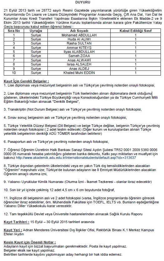 Suriye Uyruklu Öğrencilerin Yatay Geçişi Başvuru Sonuçları